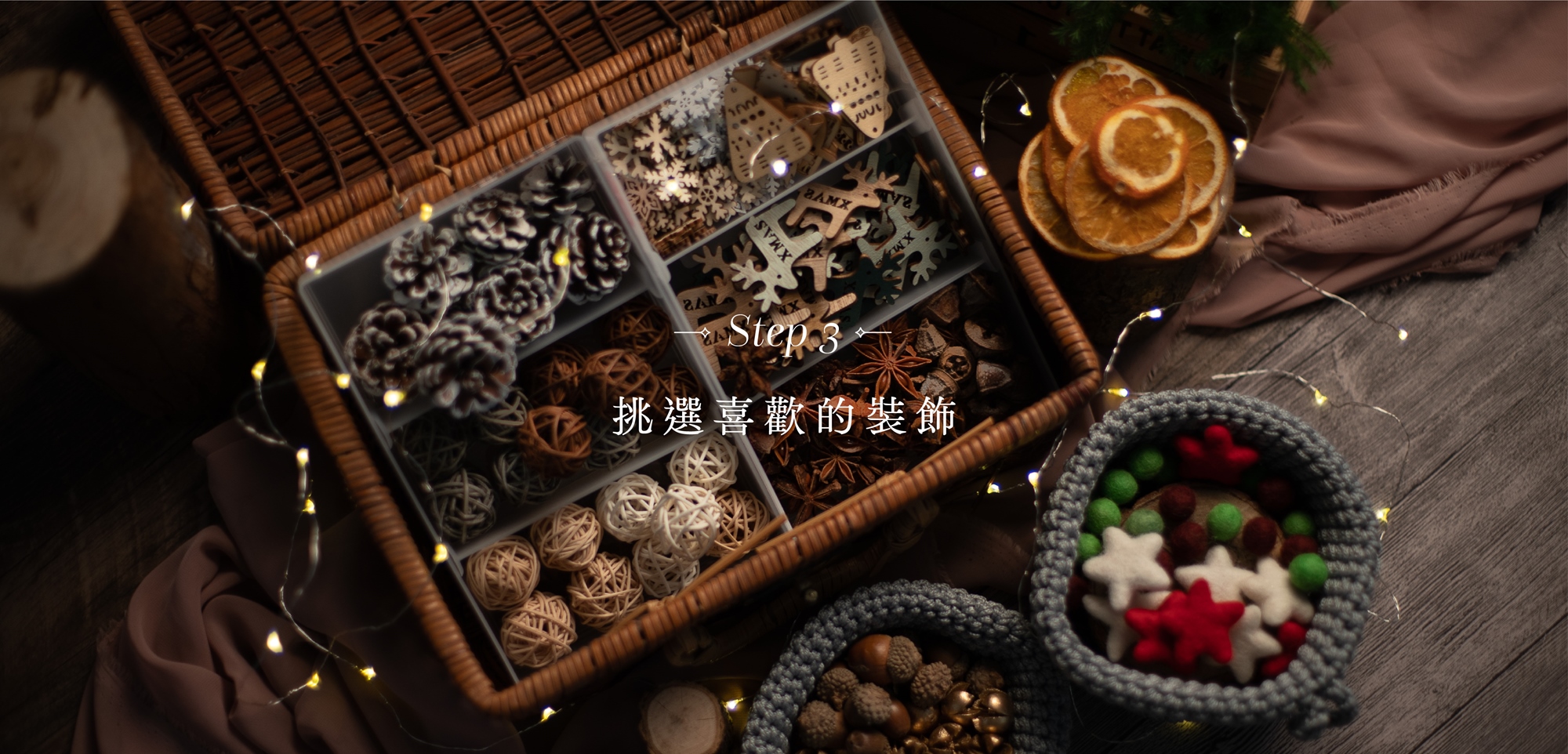 接著挑選自己喜愛的果實以及裝飾品,一步步製作出獨一無二的聖誕小樹,隨著輕鬆活潑的環境氛圍渲染,在冬天裡配上一杯暖呼呼的熱紅酒,這個冬天,來場五感體驗的手作課程吧!