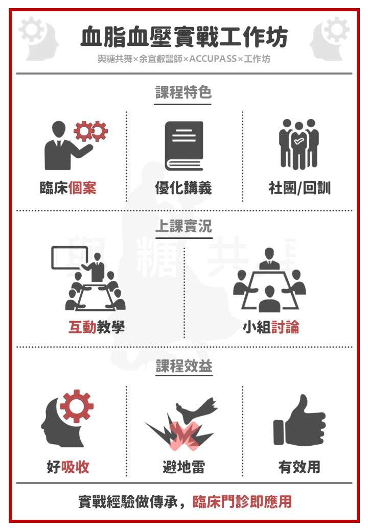 有效快速地提升照護經驗。針對血脂與血壓的藥物、飲食、和運動方面,利用臨床個案的分析與討論,補充臨床處方與衛教的經驗、應對、失敗與成功個案細節、以及更多心法。期許課後學員們可立即應用,造福更多高血脂與高血壓族群。
