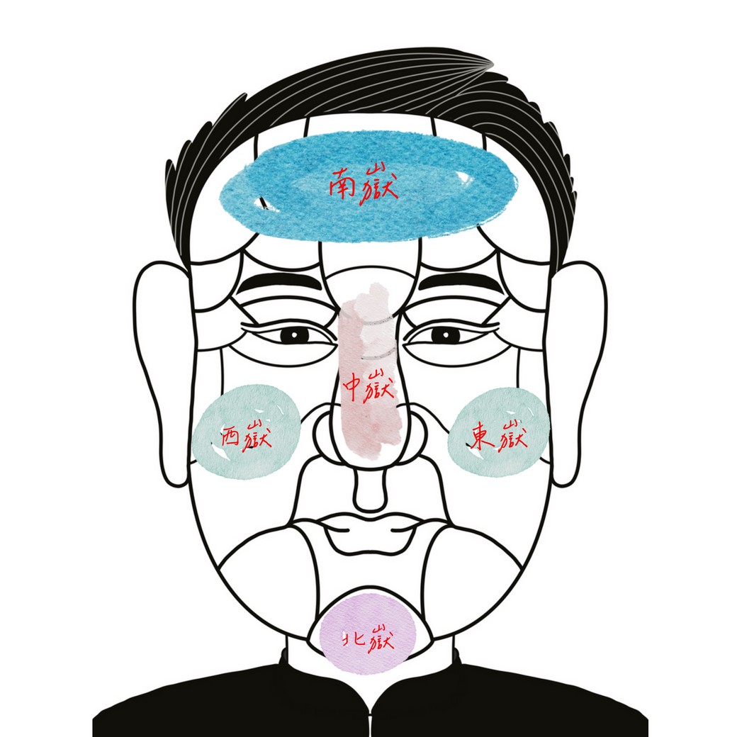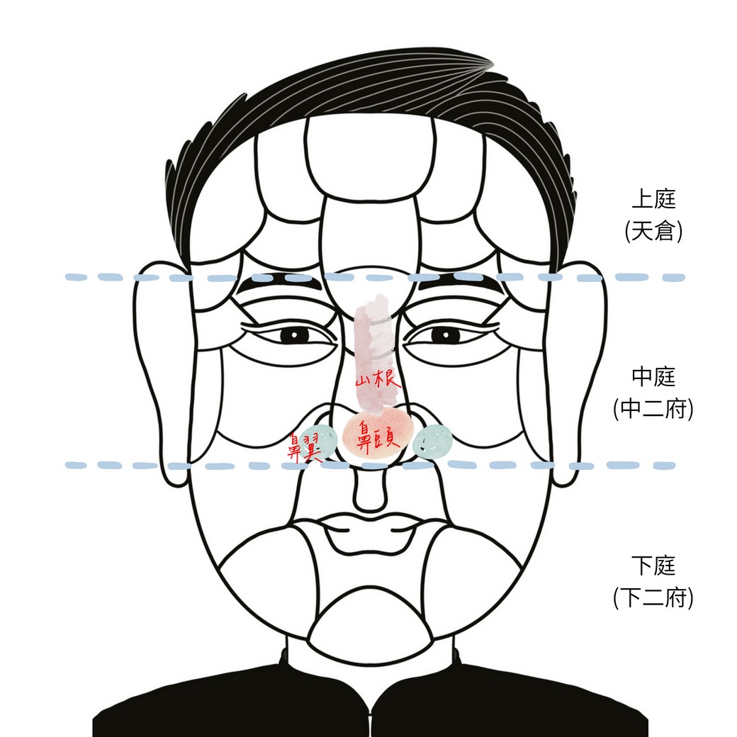 額頭、印堂、眉毛、眼睛、耳朵、鼻子、人中、顴骨、地閣、口唇、牙