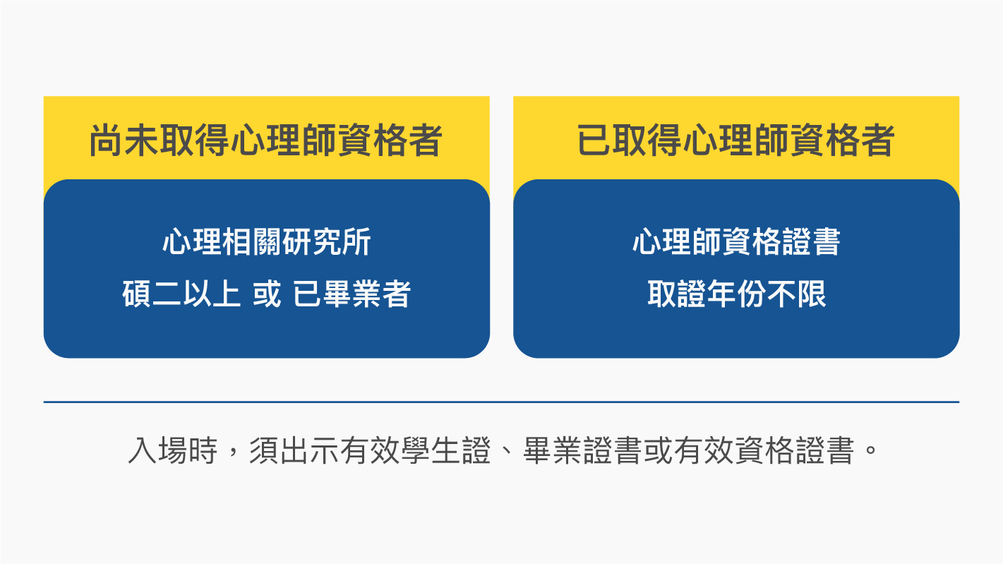 未取得心理師資格者,須為心理相關研究所碩二以上或已畢業者,入場時請出示有效學生證或畢業證書。