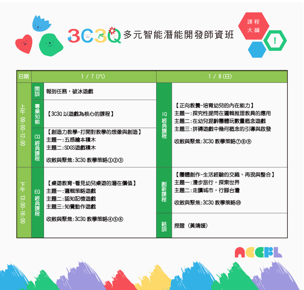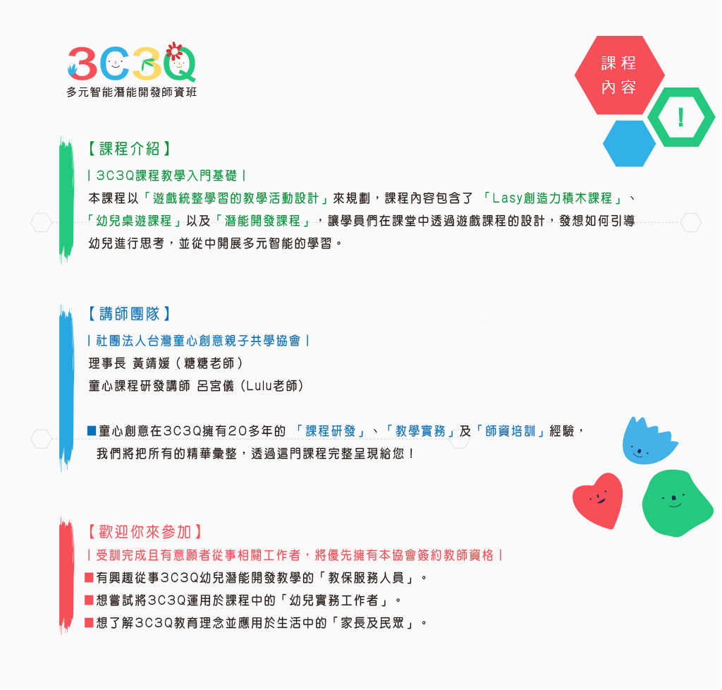 ■童心創意在3C3Q擁有20多年的 「課程研發」、「教學實務」及「師資培訓」經驗, 我們將把所有的精華彙整,透過這門課程完整呈現給您!