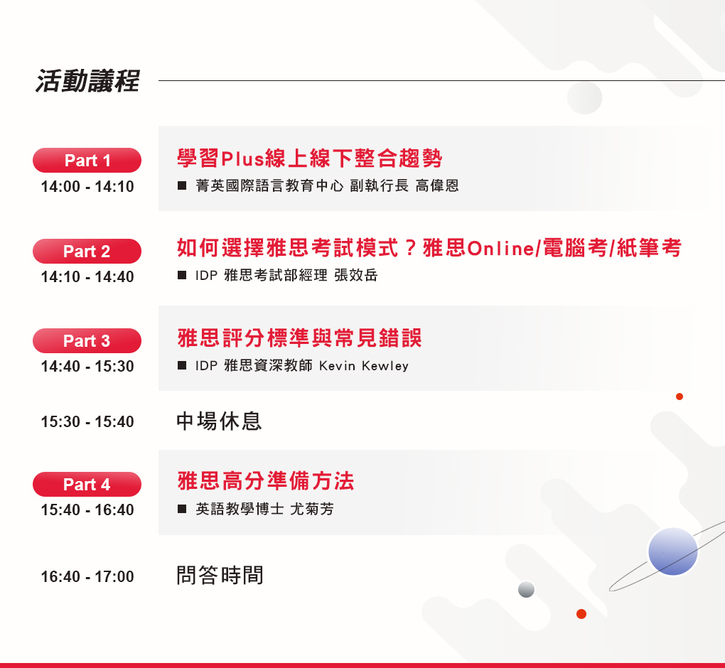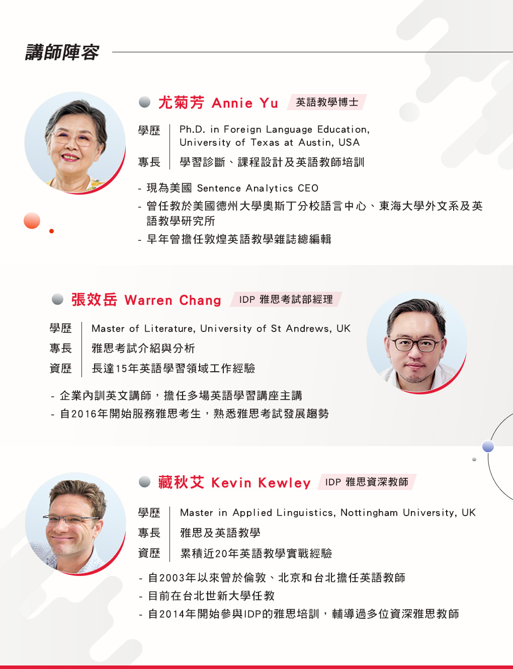 本次ELITE X IDP 2023 留學考試趨勢年會,先以雅思主題出發,今年隆重邀請到IDP雅思考試部 經理 及 資深教師、英語教學權威 尤菊芳 博士等學界的專家,從選擇考試模式X評分標準X常見錯誤X扎實備考策略,帶給各位準備出國留學的學生最精彩有料的考試與學習分享。