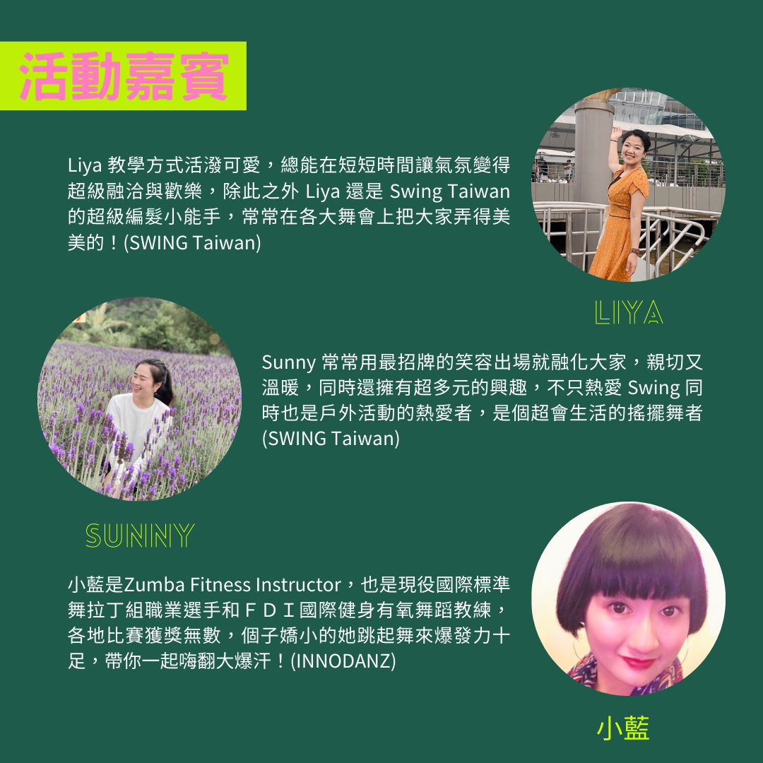 本次帶領體驗的是來自Swing Taiwan的 Liya和Sunny,Swing Taiwan社交舞與搖擺舞學校持續致力於搖擺舞推廣與教學,其理念為“在這裡你可以發自內心的歡笑、以舞會友,讓搖擺舞成為你迎接全新生活的媒介,與一群熱愛生活的好友們,豐富彼此的社交生活。