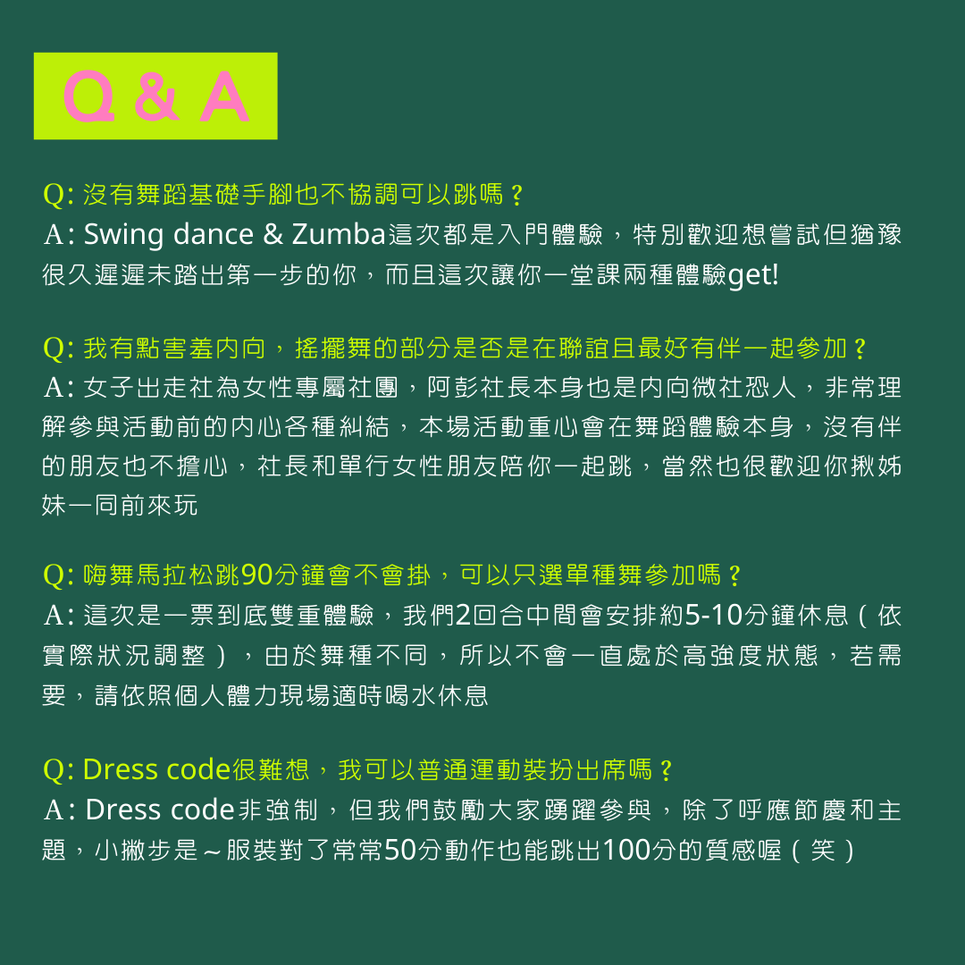 女子出走社與Swing Taiwan以及InnodanZ的老師們合作,給大家一個歡樂抒壓又燃脂的90分鐘嗨跳馬拉松,聖誕舞曲non-stop! 復古爵士風格的Swing dance讓你隨著爵士樂曲輕鬆搖擺起舞;拉丁風格的有氧Zumba讓你的熱情活力燃起來!聖誕佳節就是要歡樂一起過!