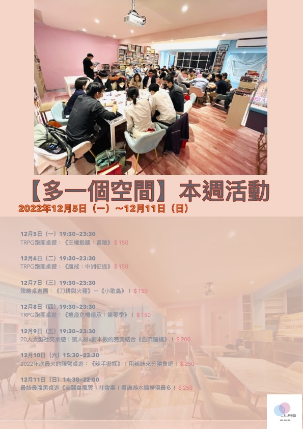 「多一個空間」由【多多看電影】的部落客-多多 所創立,一個致力於舉辦各種娛樂活動的場地,是一家複合式桌遊咖啡店,座落於龍山寺捷運站3號出口,視覺裝潢以馬卡龍粉與湖水藍為主要色調,與附近巷弄的古宅呈現極大的跳躍反差。