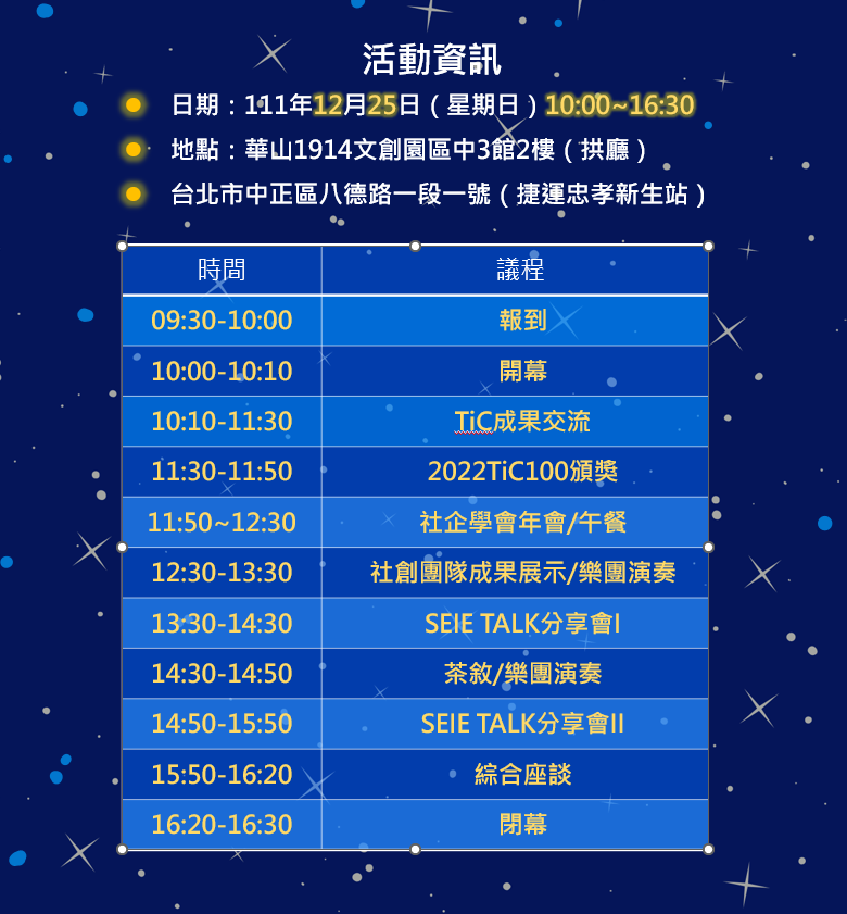 今年開始,本學會將過去累積的經驗整合,辦理「社企創業育成課程」、「業師面對面輔導」、「社企新創共榮平台」及「SEIE TALK」,邀請各領域專業講師以及過去曾經獲獎的團隊,分享交流實務經驗。本會期待藉由以上的各項活動,陪伴與培育出更多「成功的社企,有靈魂的企業」,包括Start up ( 0-1 ) 創業階段:透過交流,學習經驗;Scale up ( 1-1000 ) 成長階段:讓政府或企業有機會認識及輔助新創團隊;Soul up ( 1000-N ) 永續階段:讓企業了解並與社創組織一同實踐永續發展。相關成果將在SEIE TALK與社會大眾分享,期待各界在聖誕佳節之際共好與共創。