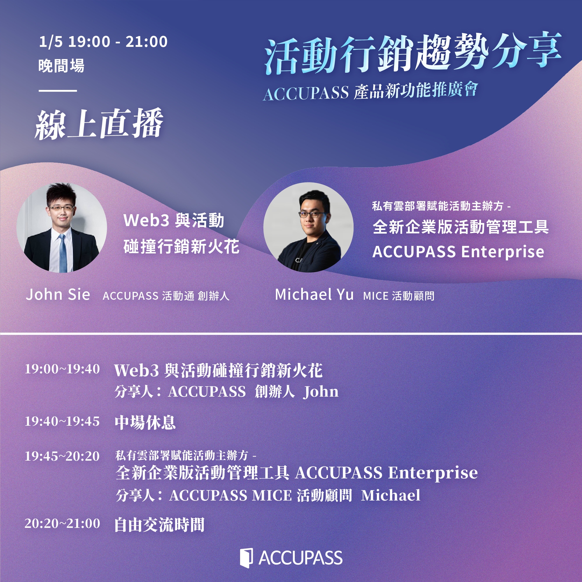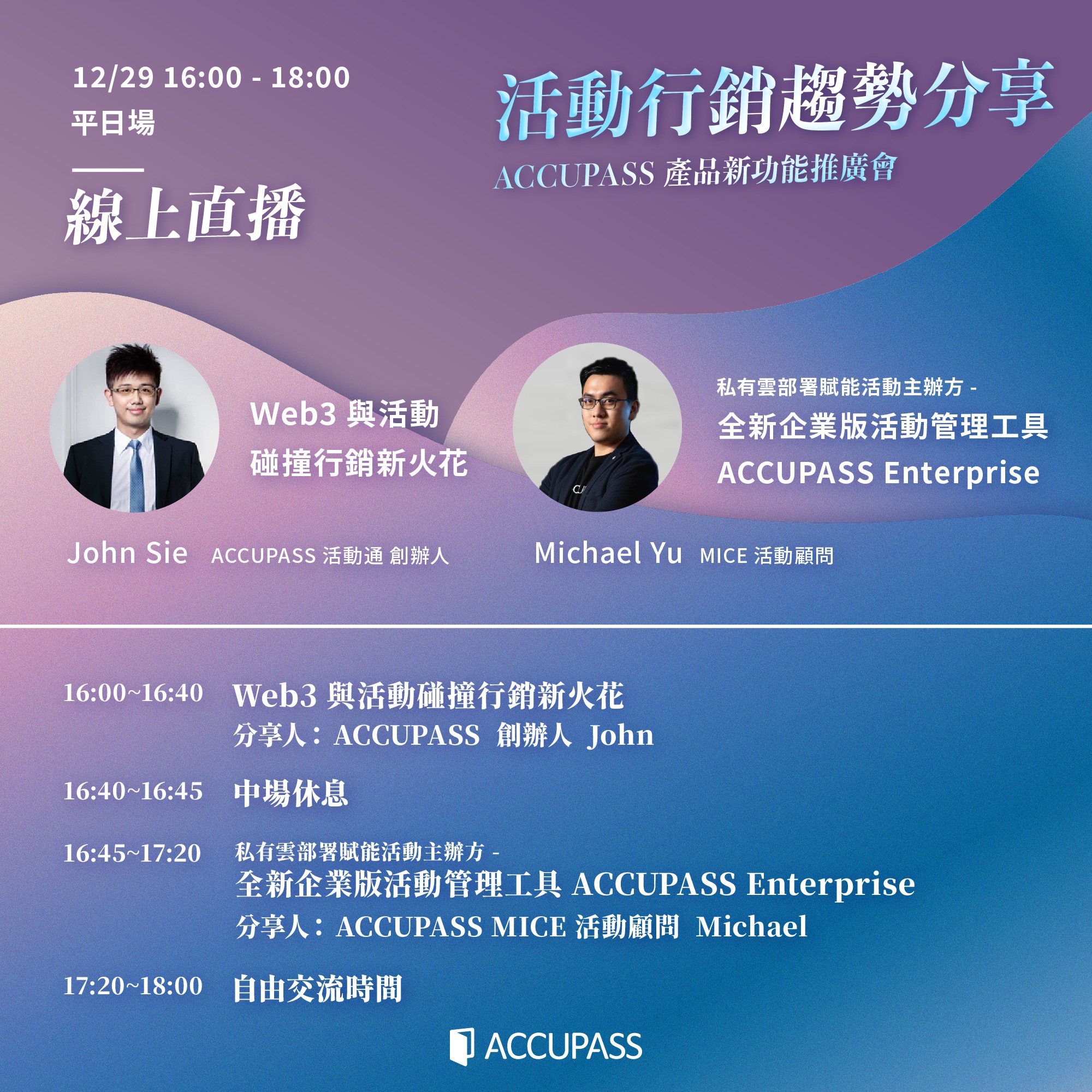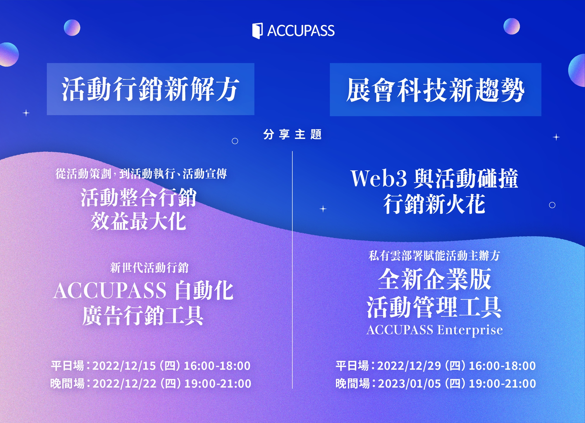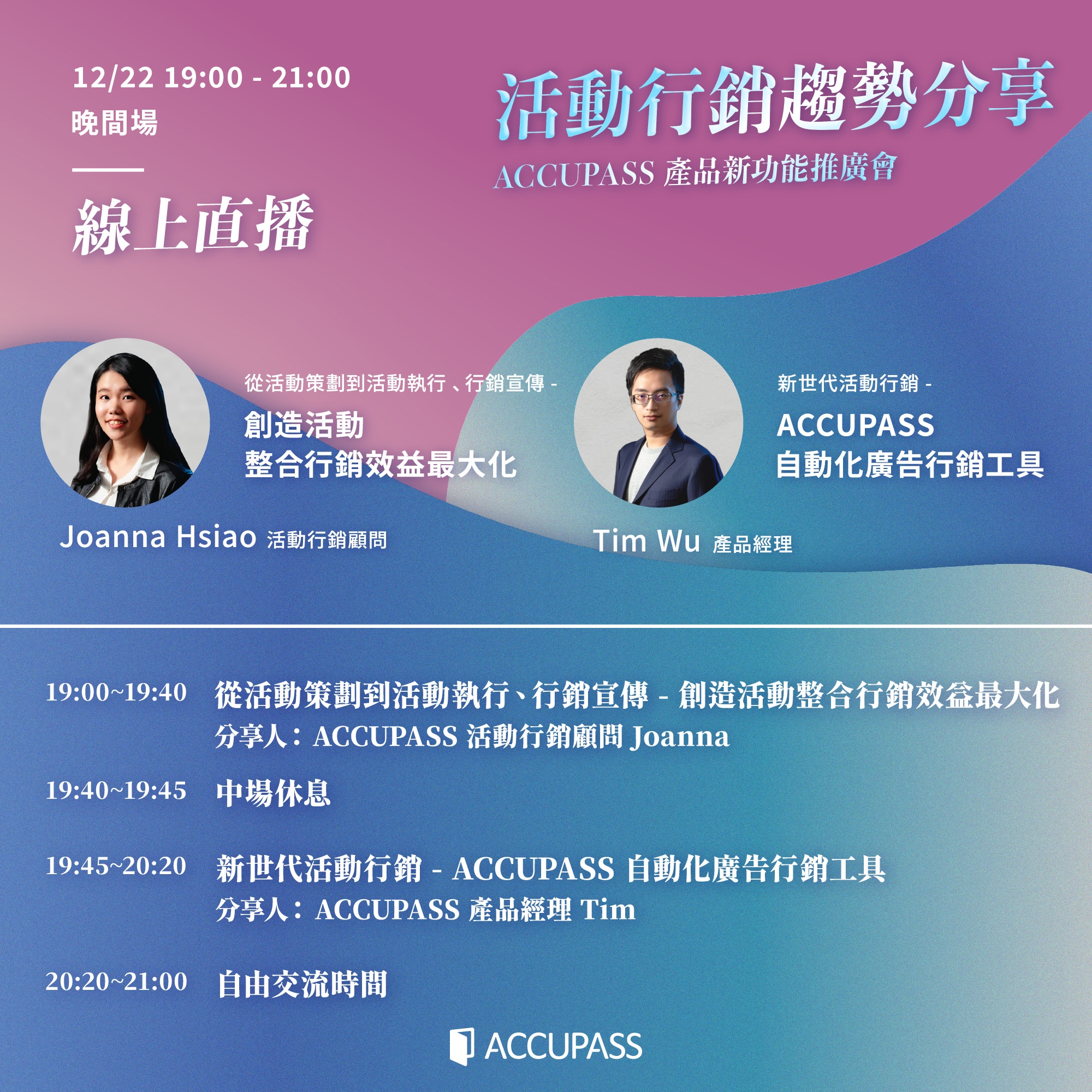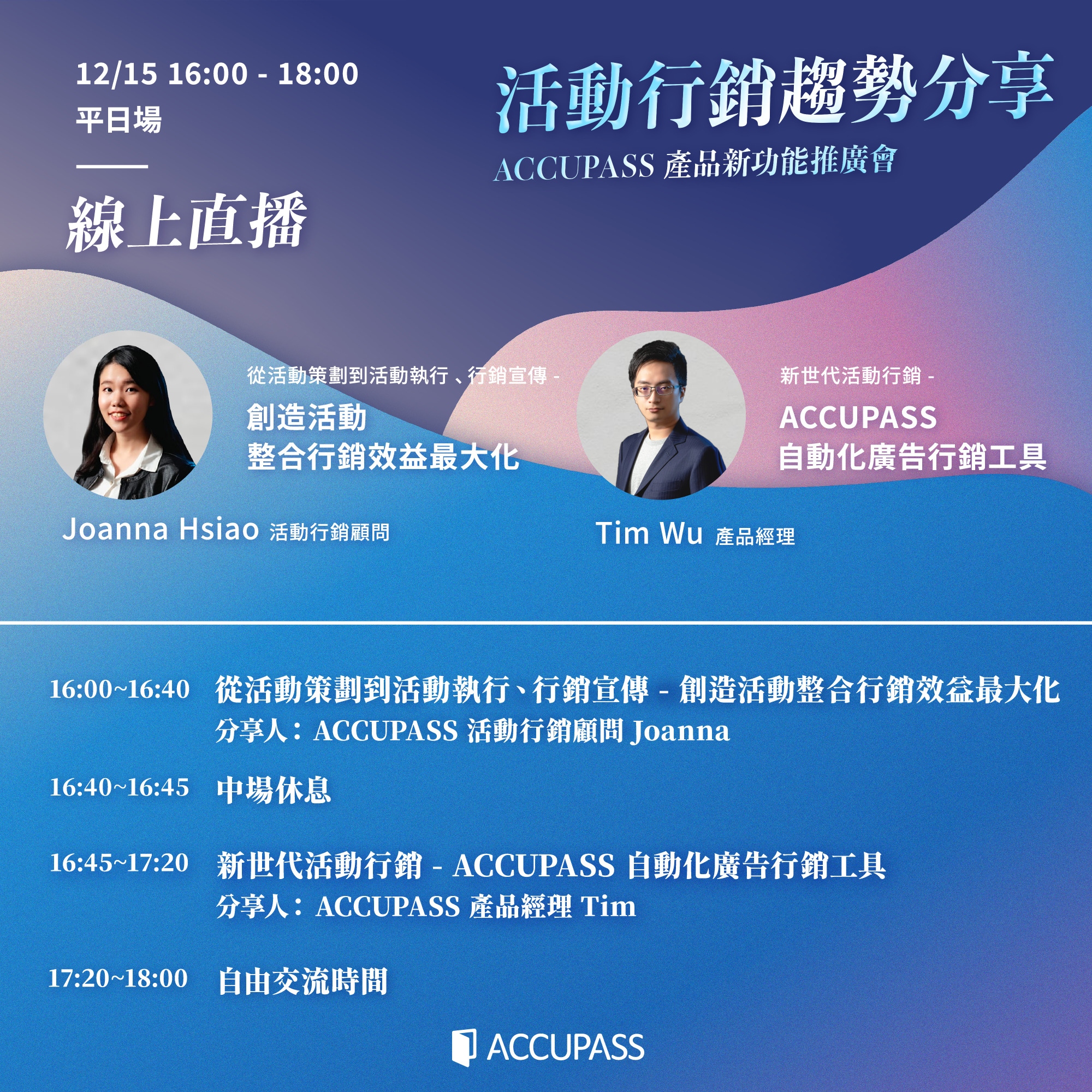 ★凡報名並參與【線下活動者】,皆有機會可享有 ACCUPASS 全新自動化行銷工具優先體驗方案!(詳情請洽詢活動現場工作人員)>>線下場傳送門