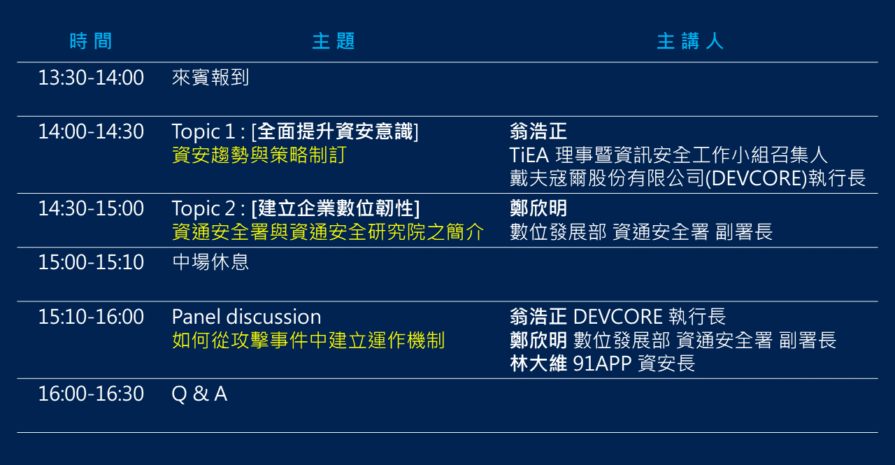 限定場次名額有限,歡迎各公司資安長、資安經理人、資安團隊、對資安議題有興趣者,踴躍報名參與!