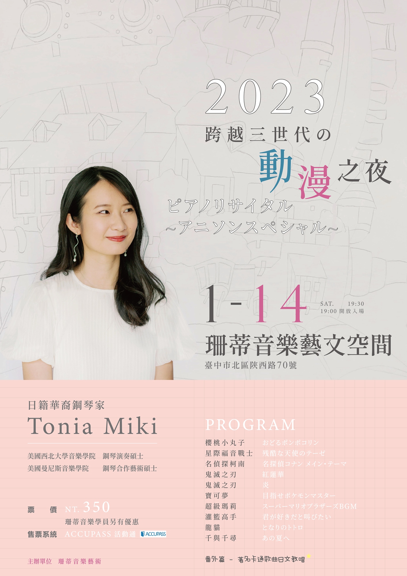 - 番外篇:由鋼琴家Tonia Miki 帶領現場觀眾學習知名卡通主題曲日文版歌曲,一同歡唱。