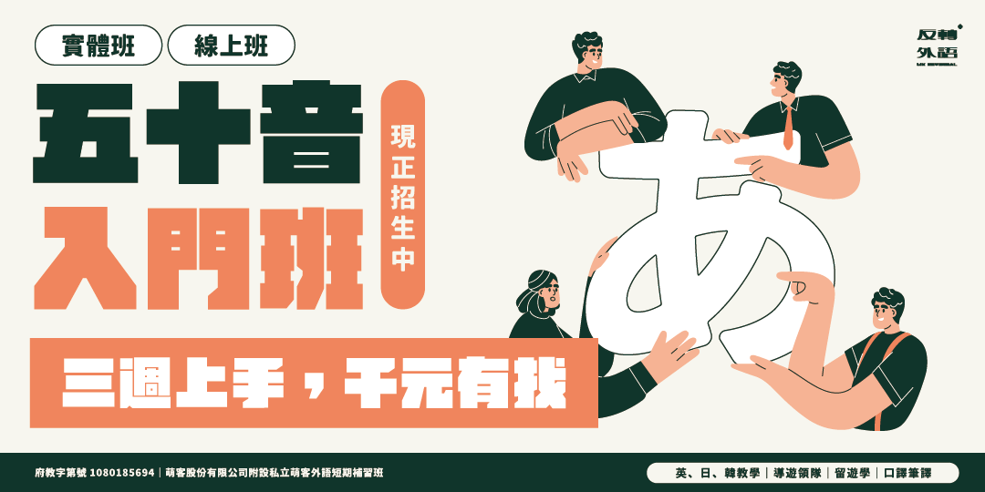 - 針對零基礎者課程從50音發音及寫法開始教學,教學內容包含:平假名、片假名、濁音、半濁音、拗音、長音、促音、鼻音、重音。