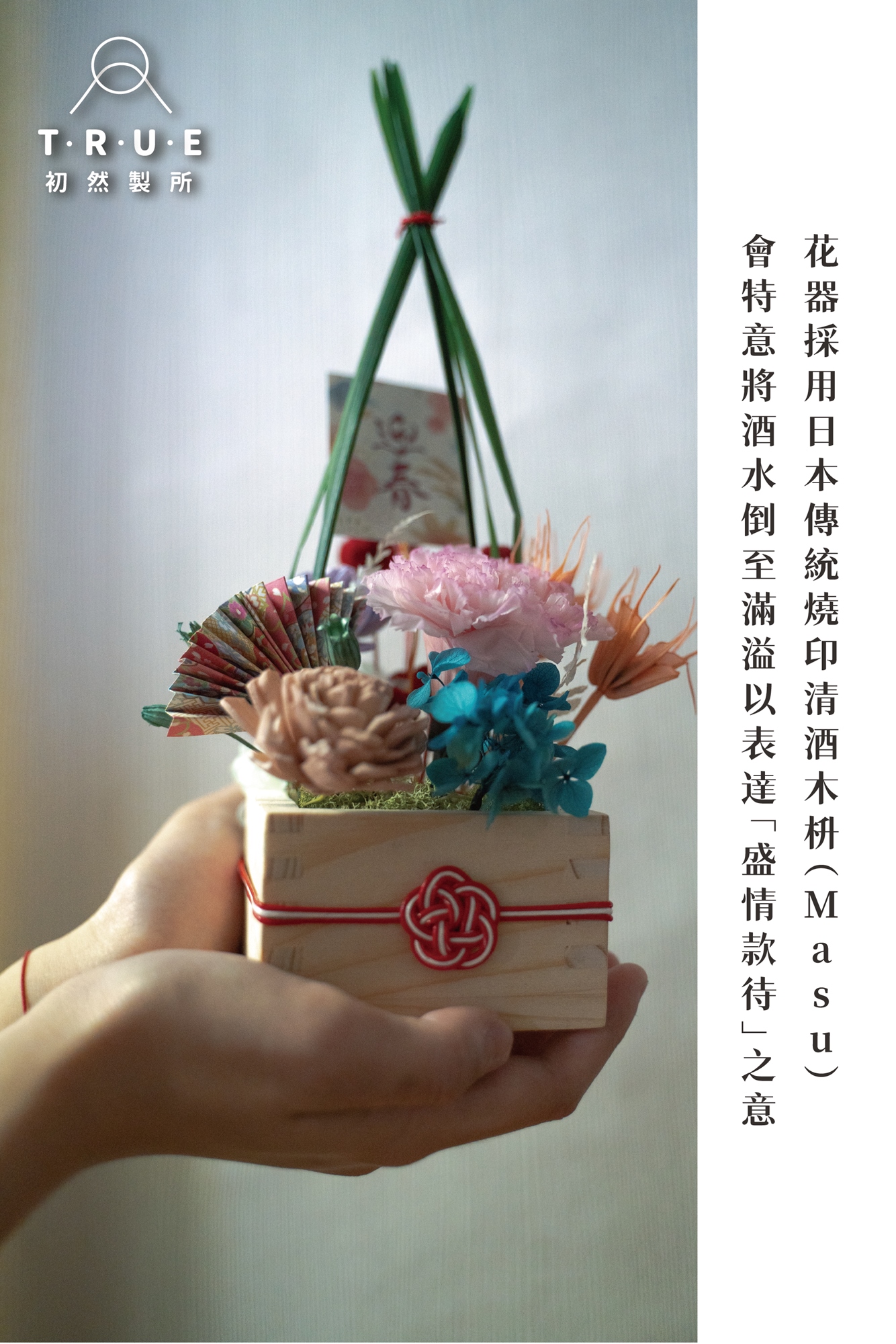 花器採用日本傳統燒印清酒木枡(Masu),由即將丟棄的木材製成,據說古時只有富人才喝的起清酒,因此會藉由故意將酒倒到滿出來表達「盛情款待」。