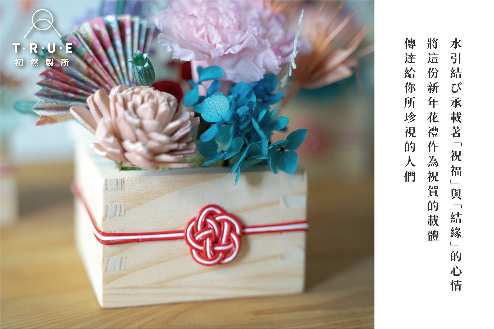 水引結び承載著祝福的心情以及我想持續與你聯繫、想得知你最近是否安好的心意,將這份新年花禮作為祝賀的載體,傳達給你所珍視的人們吧。