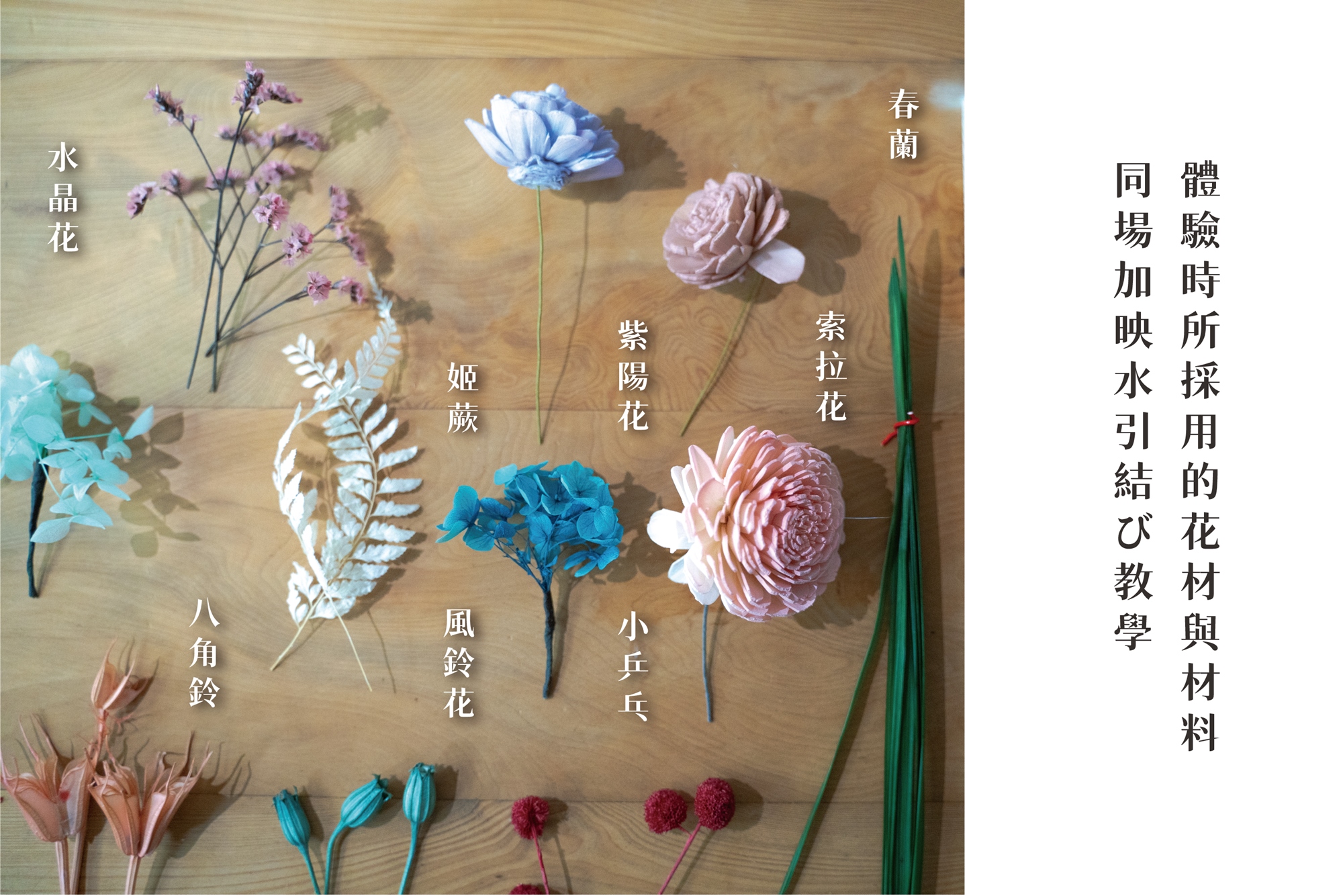 體驗內容|將採用上述花材與材料進行製作,並同場加映水引結び打法!