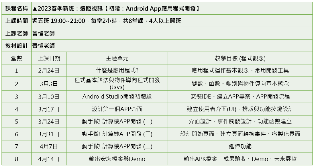 ●此班級固定:每週五晚上 19:00~21:00, 遠距線上視訊方式上課,上課期間:2023/2/24~2023/4/14,共8堂課,每堂2小時。