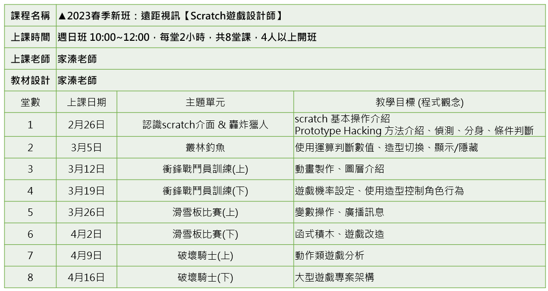 ●此班級固定:每週日上午10:00~12:00 遠距線上視訊方式上課,上課期間:2023/2/26~2023/4/16,共8堂課,每堂2小時