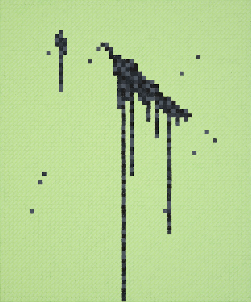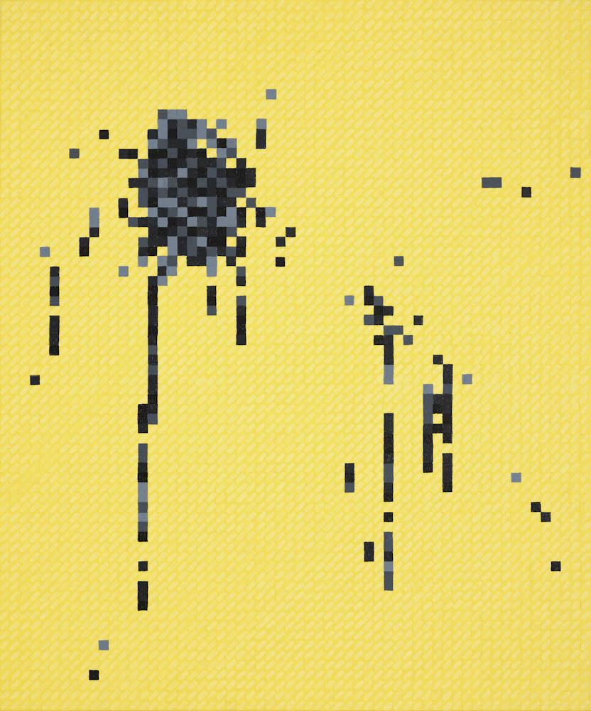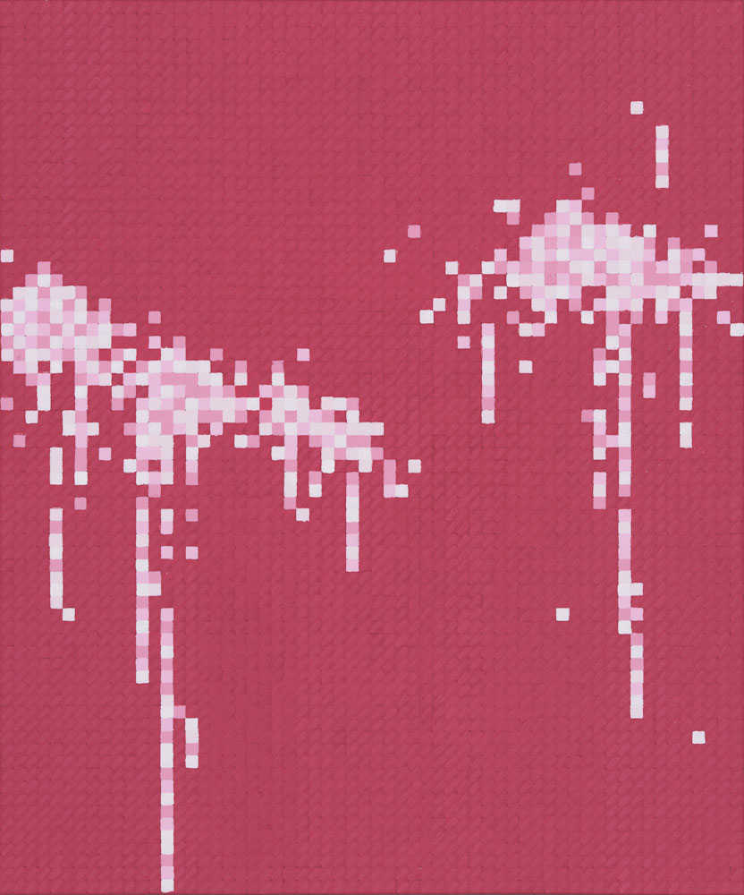 這次展出的平面新作「遠方的吸引」系列,延續過往用一公分見方的印章、逐格蓋印出顏料和內容的標誌性手法,而其章印出的圖樣,看似像繪畫顏料滴流而下的狀態,又像戰爭砲擊四射的火花或施放的煙火,也像是電腦像素圖(pixel art)的馬賽克圖樣。莊普以烏克蘭的城市為想像,為這系列作品取了敘述性的作品名稱,除了回應烏俄戰爭對世界的巨大影響,也賦予每幅畫作一個詩意的城市想像。
