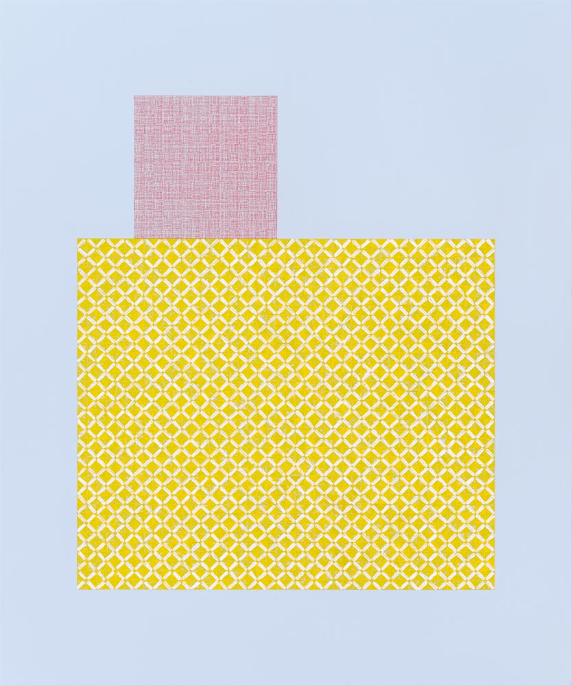 2021年創作的平面新作,莊普在原本的蓋印方章之外,加入了水墨工筆的手繪線條,雖然兩者都是機械性反覆操作的身體勞動,卻呈現出截然不同的興味,例如:《番紅花》白底之上有4道長型方塊,最上層的紅色塊是由手繪線條組成;《太陽、月亮》裡與蓋印的黃色塊毗鄰相連的紅方塊也是手繪線條而成,讓冷調性的抽象藝術展現出手感的溫度。