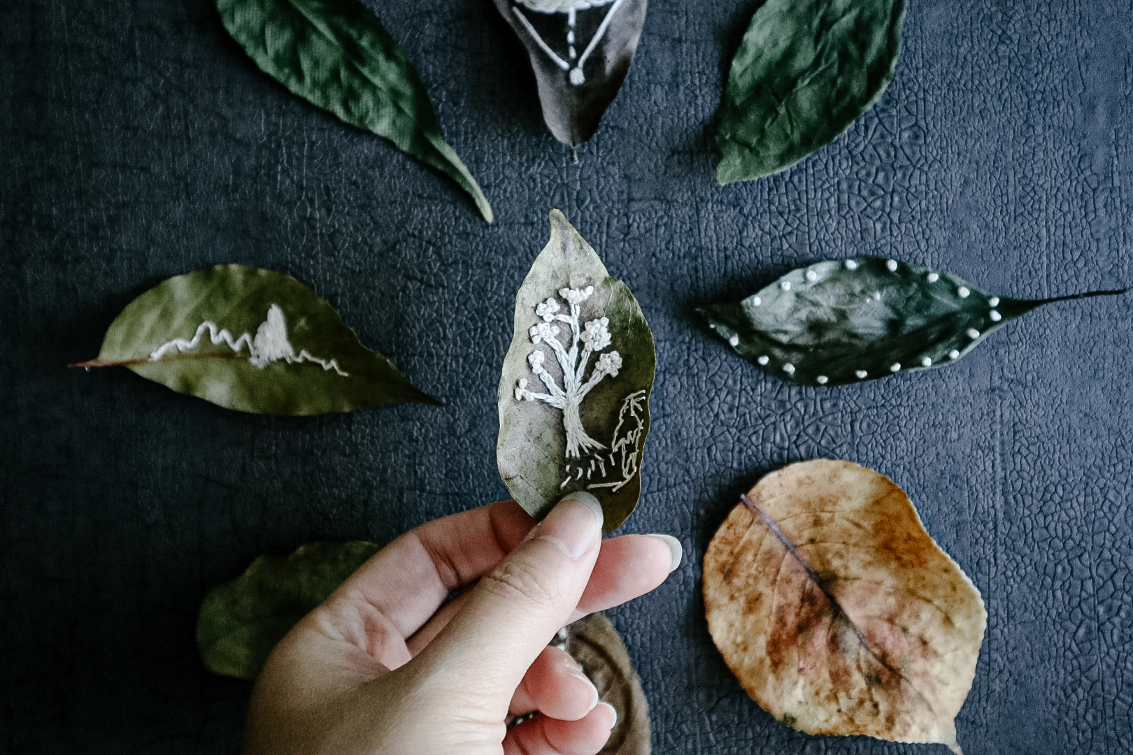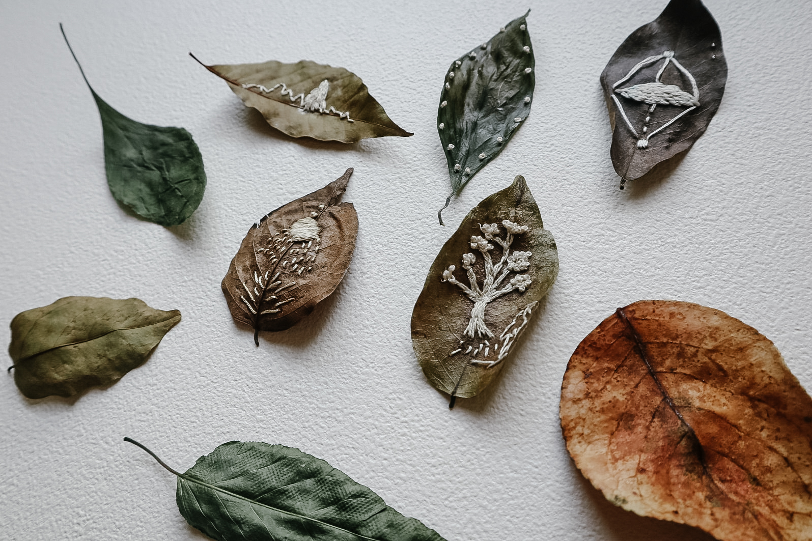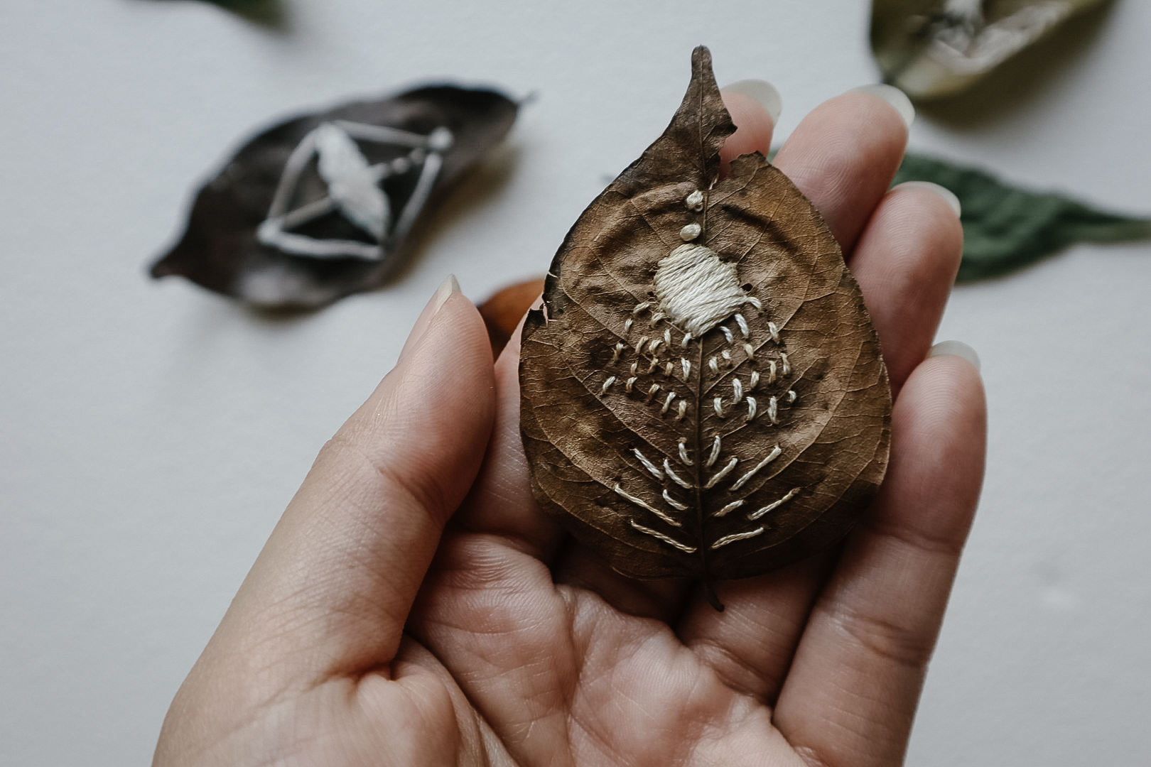 以針為筆,繡線為顏料,將生活的吉光片羽刺繡在葉子上。微觀其輪廓,細縫葉脈的紋理。