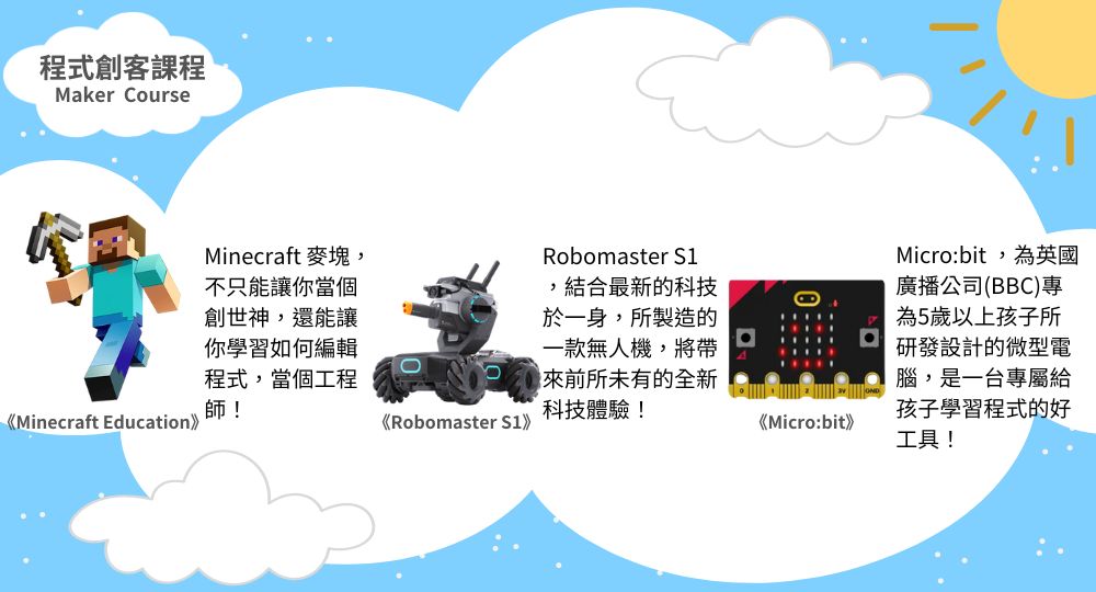 科技進步,日新月異,程式編輯已成基本技能,在未來的世界裡,程式編輯將變成每個人不可或缺的一項技能,為了讓學員能有更豐富的課程體驗,瑞智文教特別引進國際知名教具Robomaster S1與 Micro bit,集機器人與程式編輯兩者並用,學員在編輯完程式後,可以透過機器人,將程式具體實現!