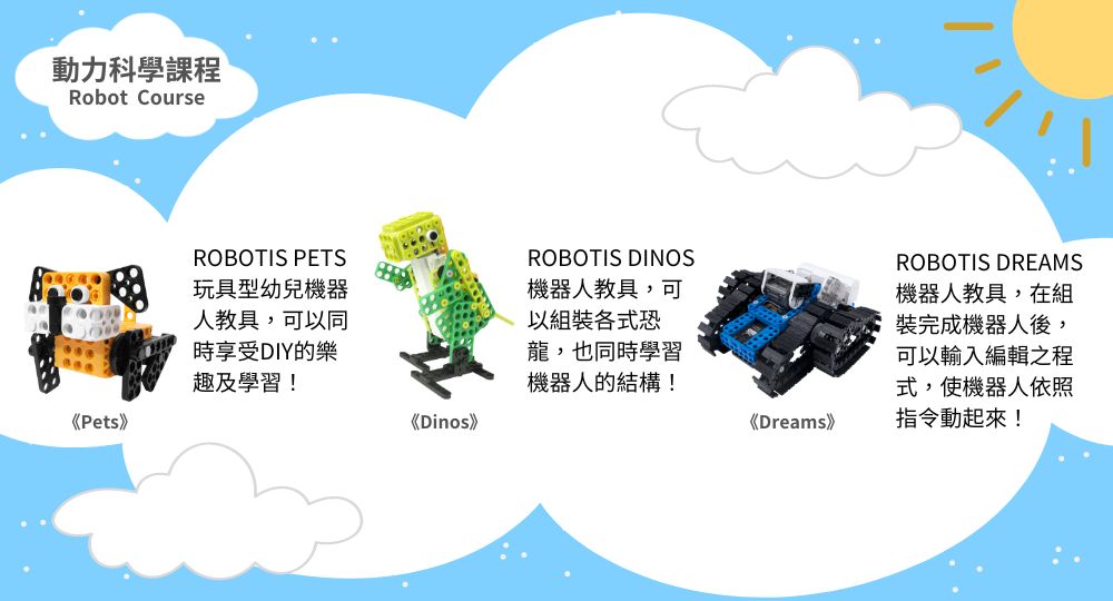 為了讓學員有更豐富的學習,瑞智文教特別引進國外知名廠牌Robotis之教具,課程活動透過充滿靈感的主題,借助簡單的結構與機械零件,組建生活中使用的工具以及物件,探索生活中的機械原理,建立自然科學概念;通過將數學和科學原理應用於組建各種機械模型,不僅可以使孩子對科學有一個感性的認識,且能夠讓他們體會到創造發明的無限樂趣。