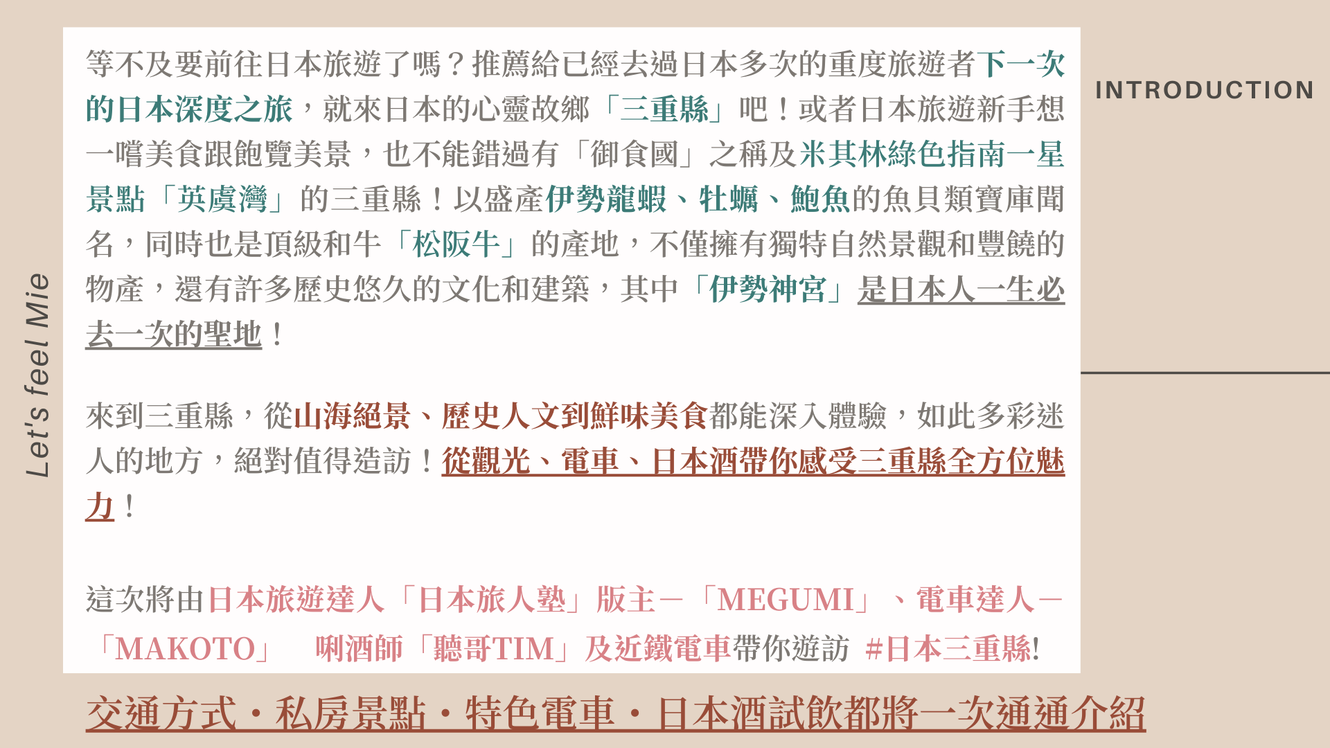 本次台北場邀請旅遊達人「日本旅人塾-Megumi」介紹三重縣最新的熱門景點與美食,以及特別邀請「近鐵電車」說明暢遊近畿地區最實惠的交通票券~