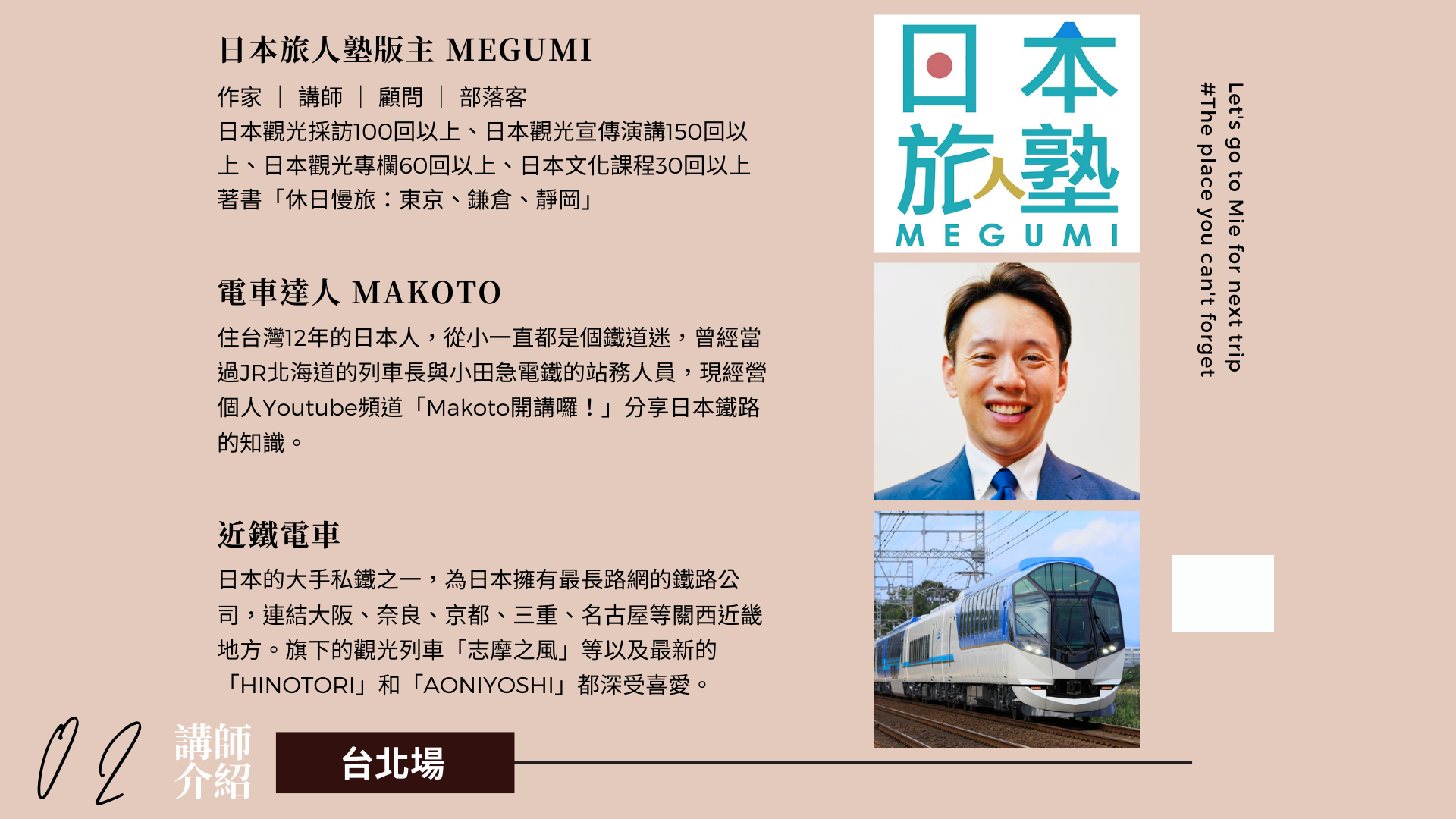 【1/14 台北場】 講師:日本旅人塾 Megumi、電車達人 MAKOTO、特別來賓 近鐵電車