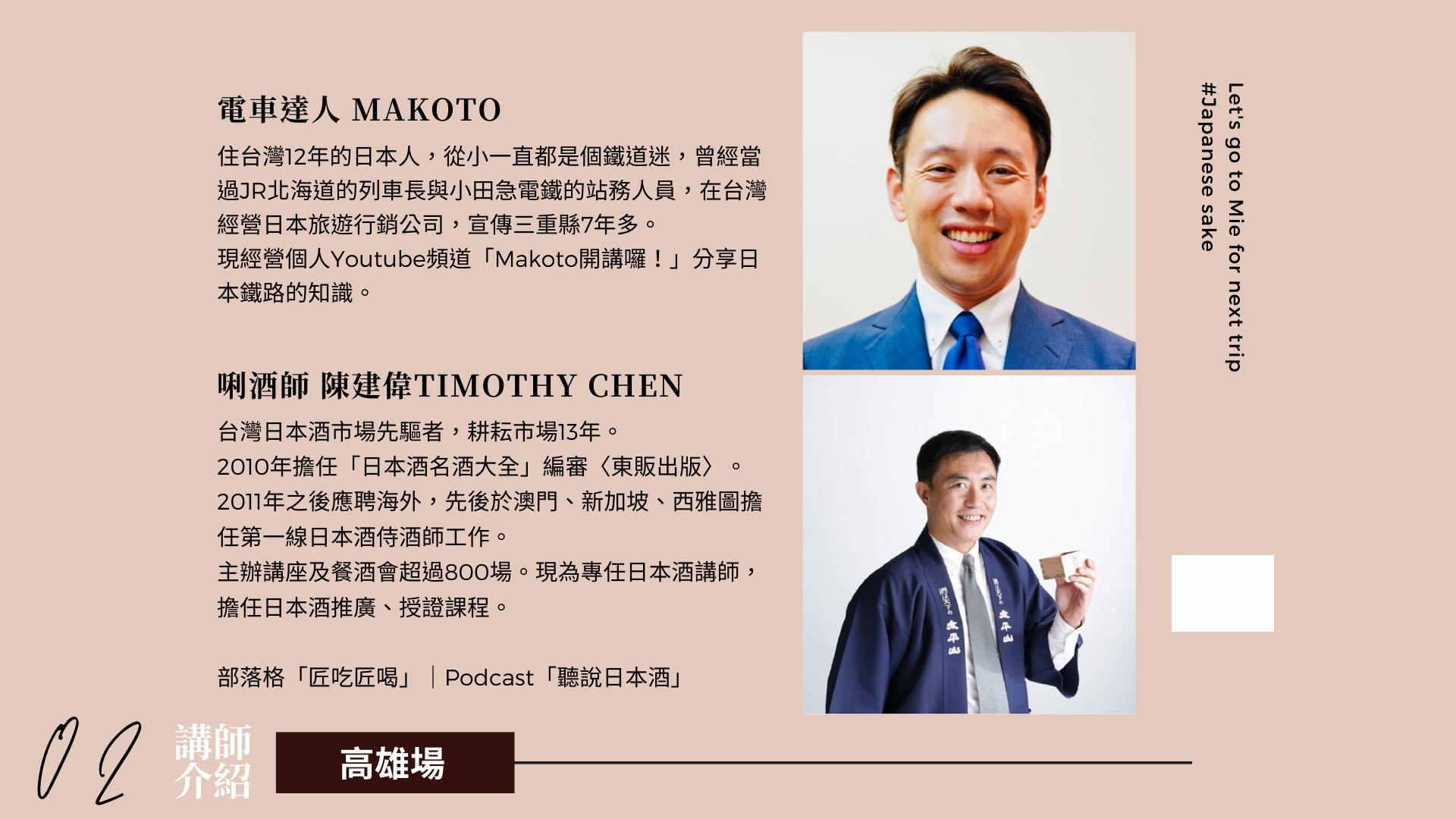 高雄場則邀請日本酒唎酒師「聽哥」帶來三重縣日本酒試飲,以及電車達人「MAKOTO」分享用電車玩三重縣!