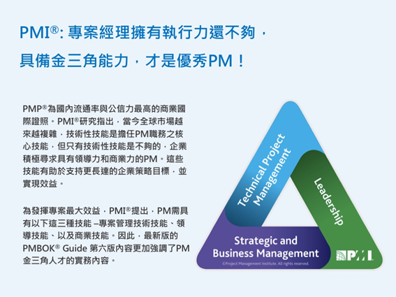 - 以PMI®的PMBOK® Guide知識體為基礎,實務導向所發展出的最佳實務(best practice)知識內涵。
