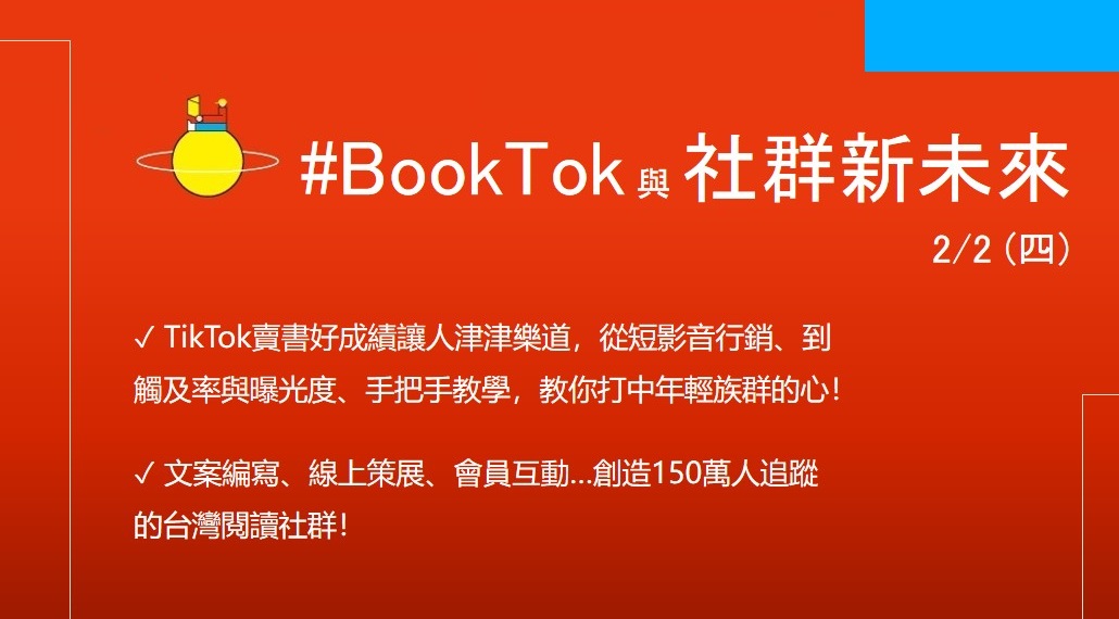 14.00-15.00 | 1.TikTok手把手行銷 #BookTok神速崛起,Amazon也為此設置新部門積極賣書,歐陸的成功案例一再令人津津樂道。TikTok看熱鬧更要懂門道,善用行銷利器第一步、打中年輕族群的心…請別錯過這門精彩課程。!