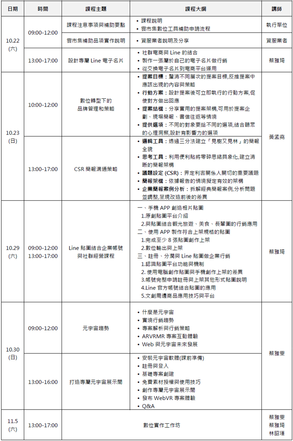本次課程由北市產業局全額補助還可以申請壹萬元數位工具現金補助,課程內容豐富,包含: