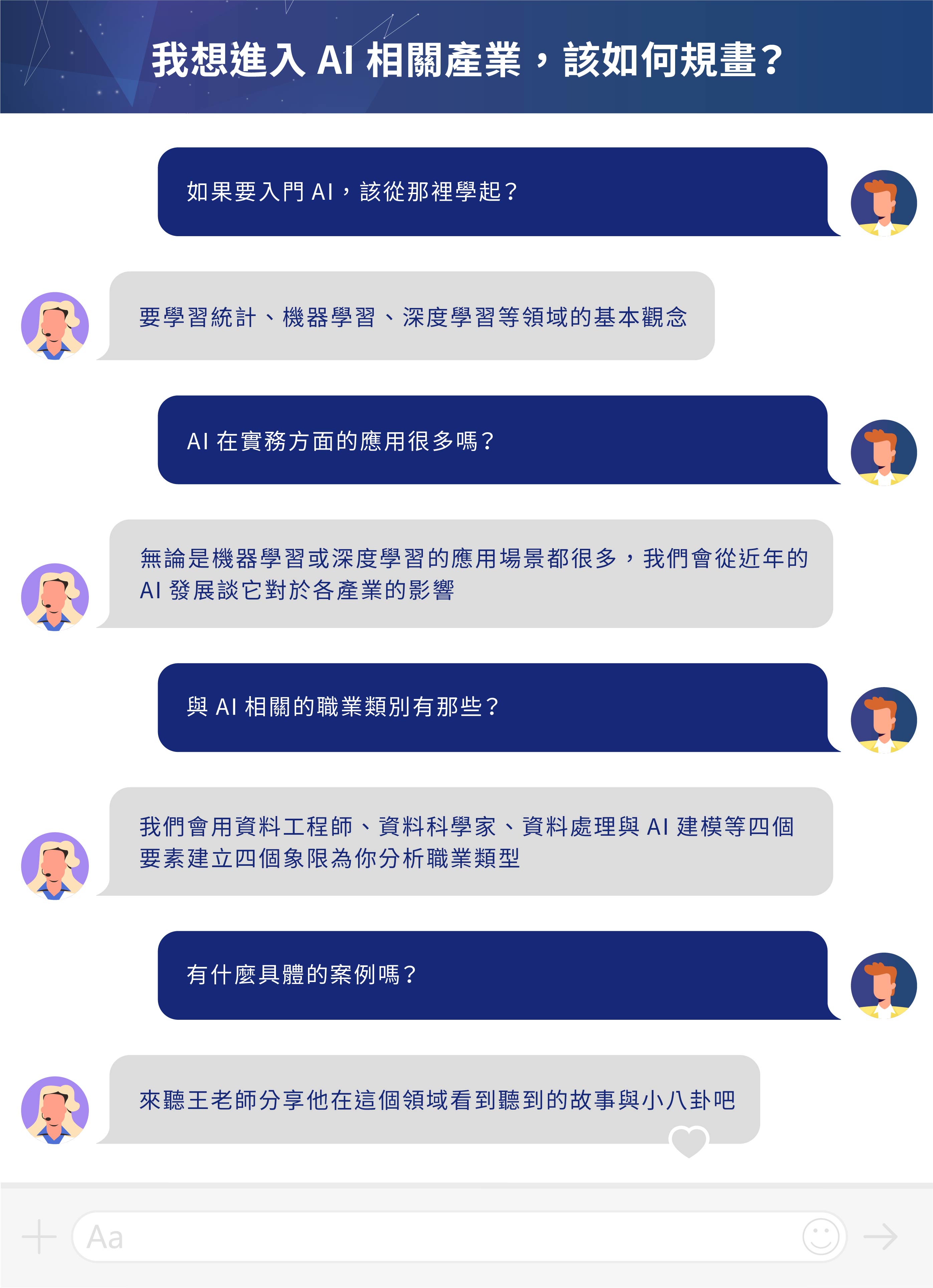 AI人工智慧是一種領域跨度極大的一種應用科學,包括資料工程、資料科學、軟體工程與領域知識經驗等諸多領域,任何人想要窮盡所有的學習時間來精通所有領域基本上是不大可能的事,但我們可以試著從自已擅長或喜歡的領域開始點AI技能樹,這樣不但容易建立學習信心,而且可以從自已擅長的起點開始累積實務經驗,進而進入適合的職業開始發展。因此,你的選擇將深遠的影響你在AI職業領域的發展性與存活率。