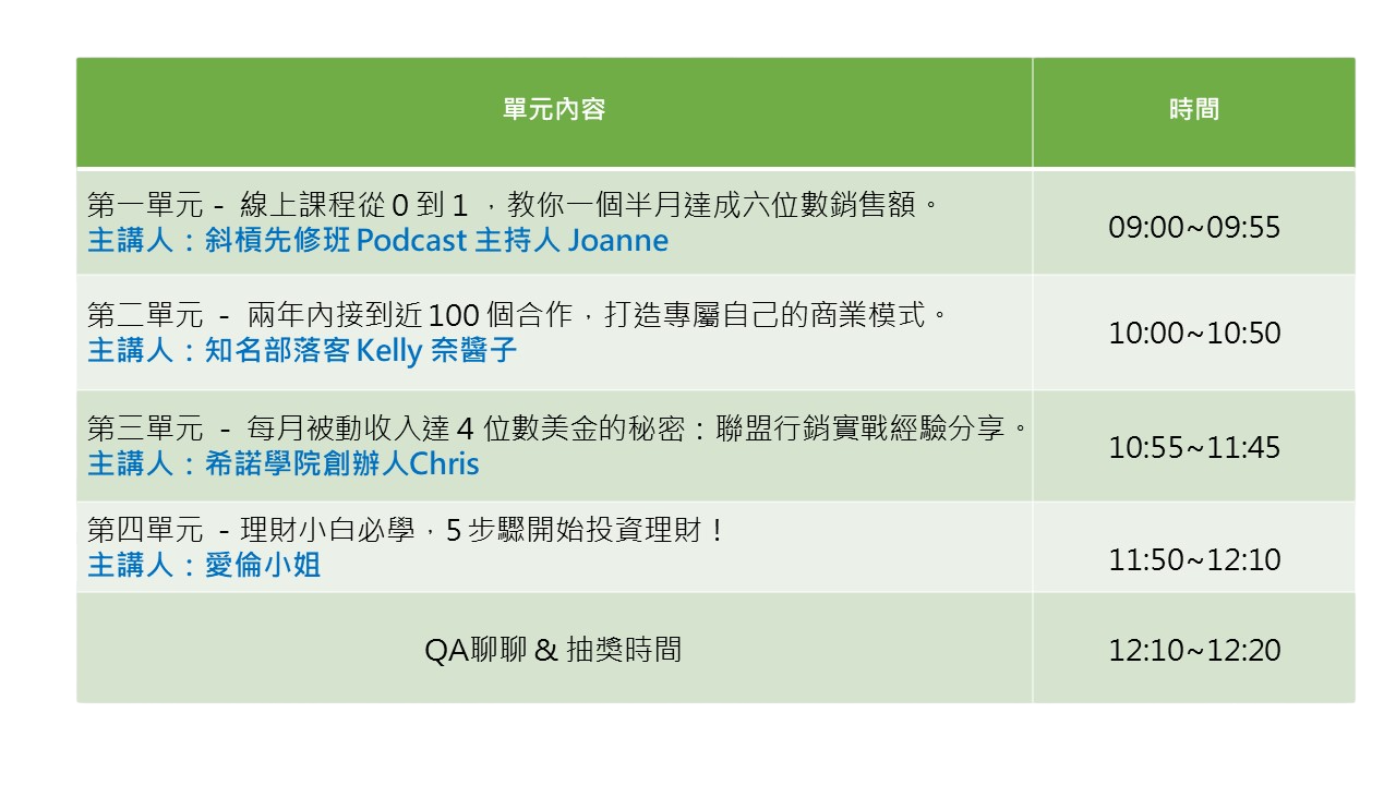 聽完這場講座,對於打造多元收入與創業,你會更有方向和概念,而且可以馬上就可以開始低成本創業,有點子有想法,有一台筆電,無論你在哪裡,現在身上有哪些身分,都可以立刻行動囉!