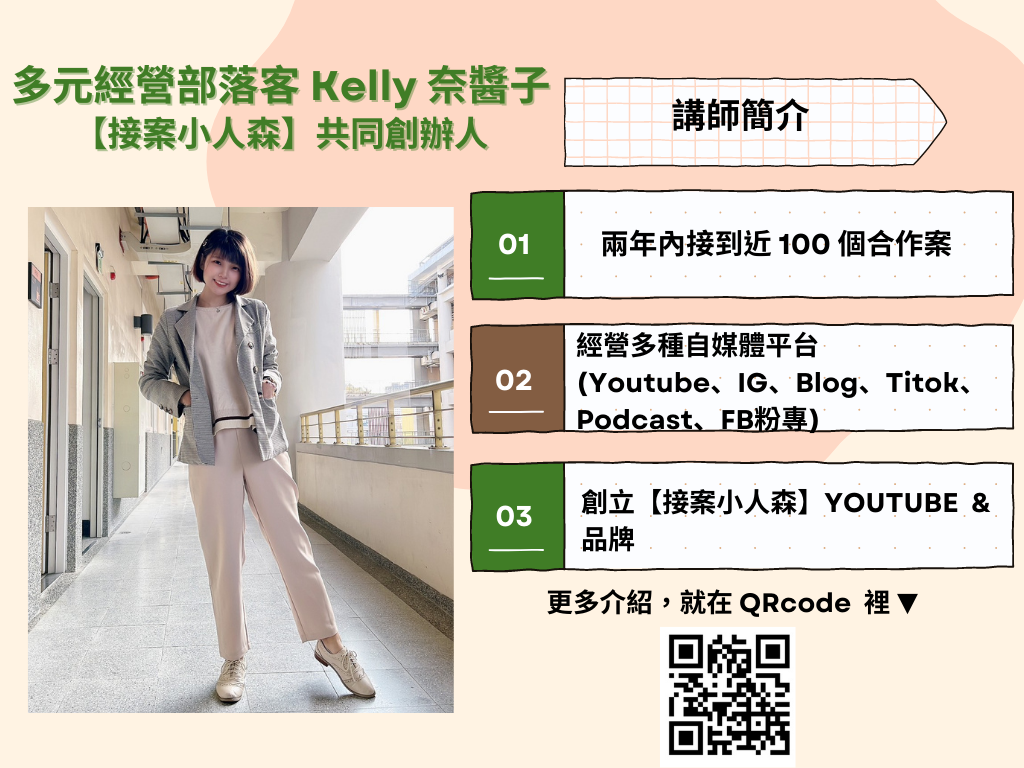 我是 Kelly奈醬子,在行銷領域工作有 4 年的經歷,是樂於分享生活、接案的八年級生。