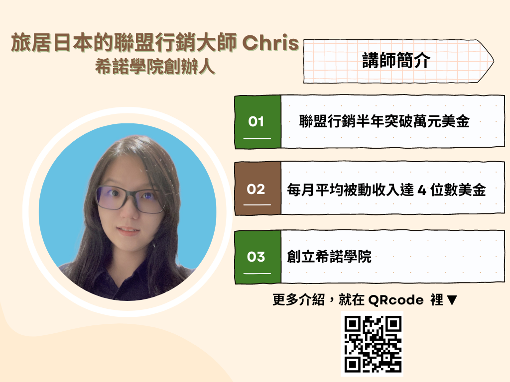 嗨,我是Chris,一個愛好自由的數位遊民,同時也是希諾學院的創辦人,目前旅居日本。