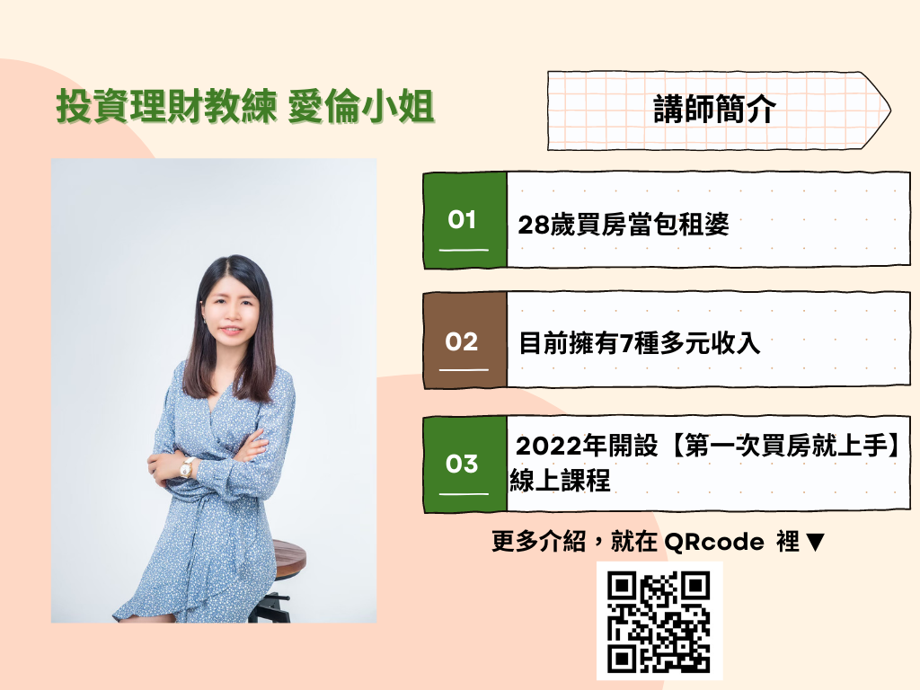 Hi~我是愛倫小姐Ms.Ellen,28歲時買房成為包租婆,研究所畢業後就開始學習投資理財至今已經近10年,我熱愛美股和房地產等投資工具,現在每年都有穩定的獲利及被動收入,目前的我已經擁有七種多元收入。
