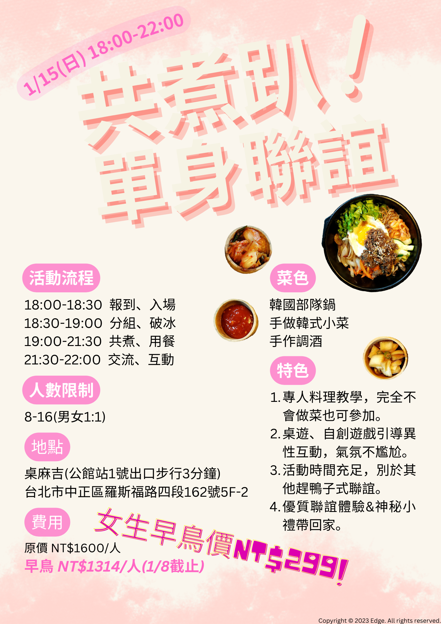 A: 好問題!Edge也挺納悶為什麼很多其他的主揪只揪得到男生,篩選參加者、控制性別比以維持活動品質應是主揪的責任。