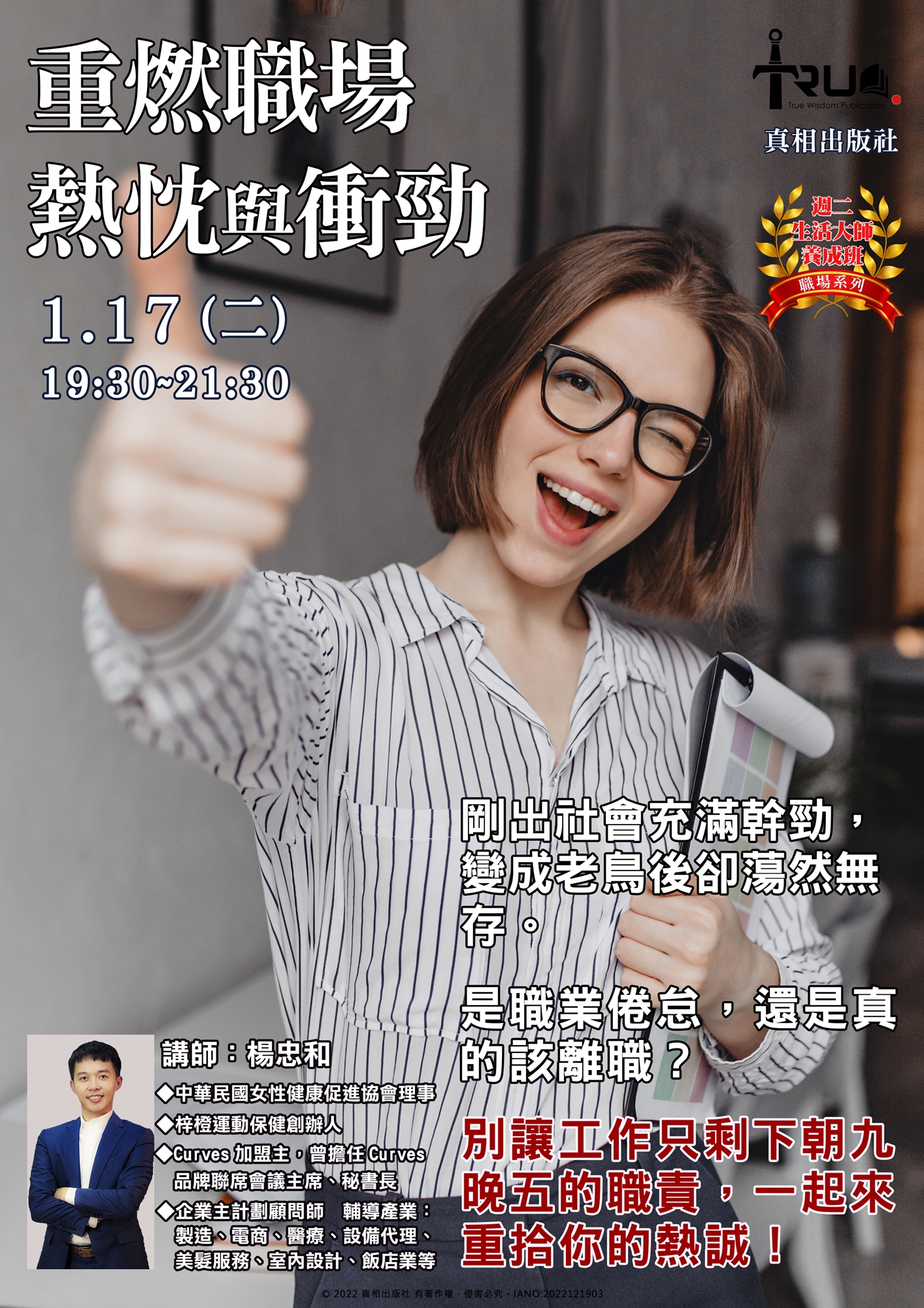 同個工作做了4、5年,多少都會面臨「職業倦怠」的問題,生活的意義變成每日打卡上下班,工作也只是虛應故事,到了這個階段,許多人都會考慮是否該轉職,畢竟對原本的工作已經沒有熱忱,只是貪圖這份安逸感罷了。若你正處於這種狀態,遞出辭呈前,不妨來聽聽此講座!