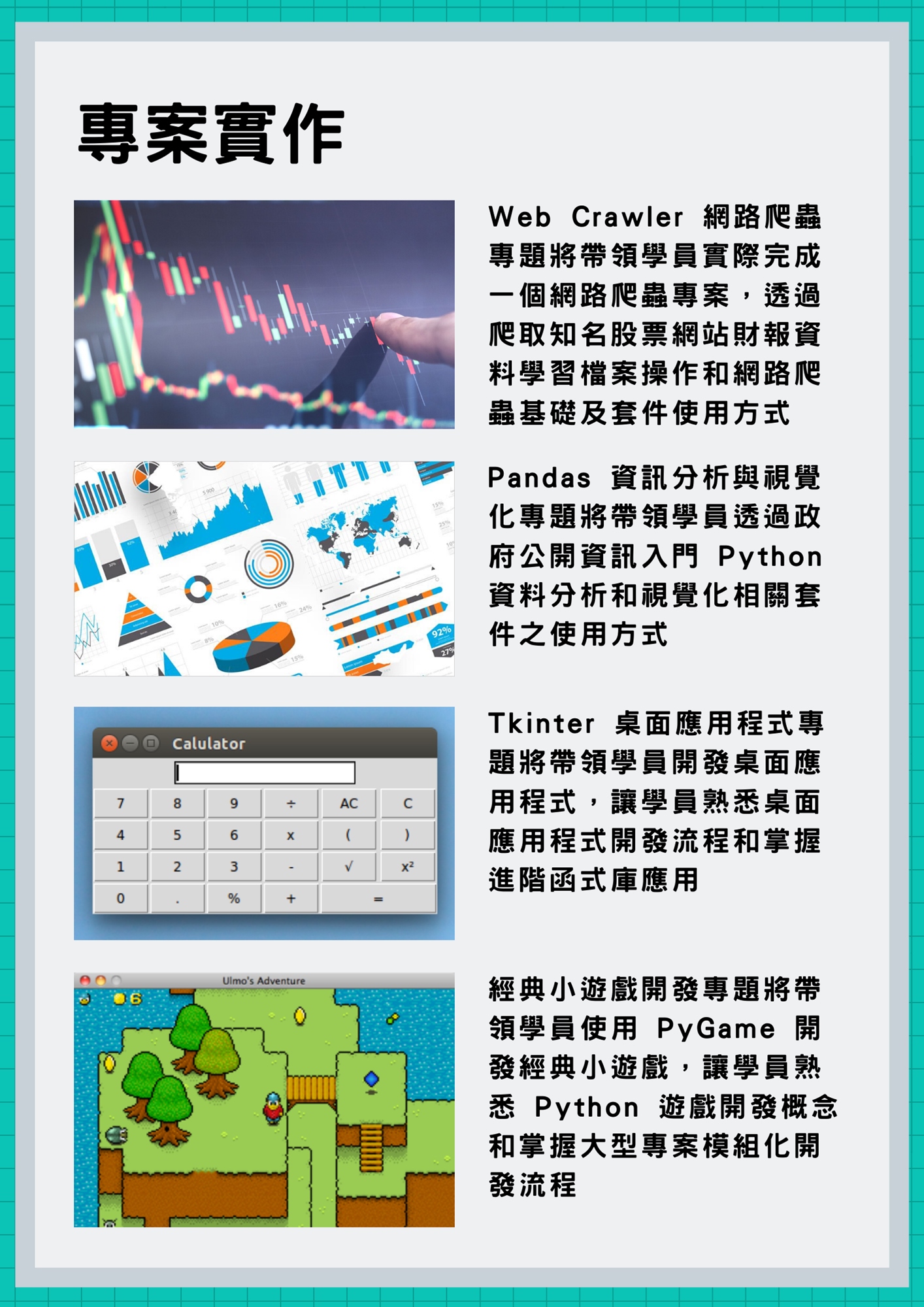 - 累積 4 大專題作品實作經驗,建立基本程式設計應用能力