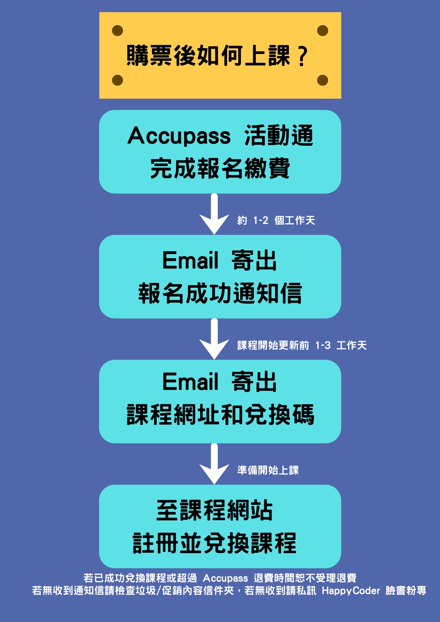 - 成功報名繳費後將收到報名繳費成功通知信,我們將於課程活動正式開始前 1-3 個工作天寄出標題為課程兌換碼和課程網址的通知信,請參閱課程通知信中教學完成課程兌換。若無收到請先檢查 yahoo/hotmail 垃圾信件夾或 gmail 促銷內容信件夾,若無則請來訊我們來協助您。