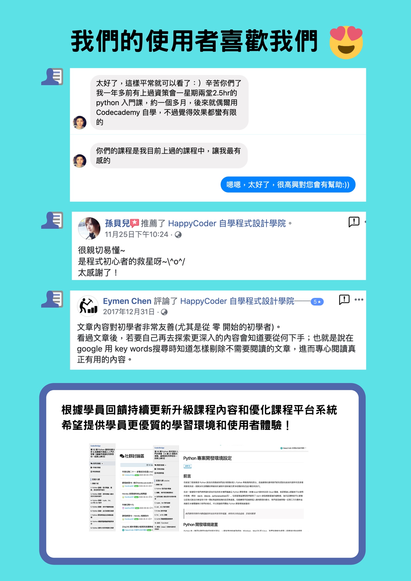 - 根據學員反饋持續更新升級課程內容和優化課程平台系統,以提供學員更優質的學習環境和使用者體驗