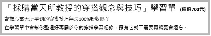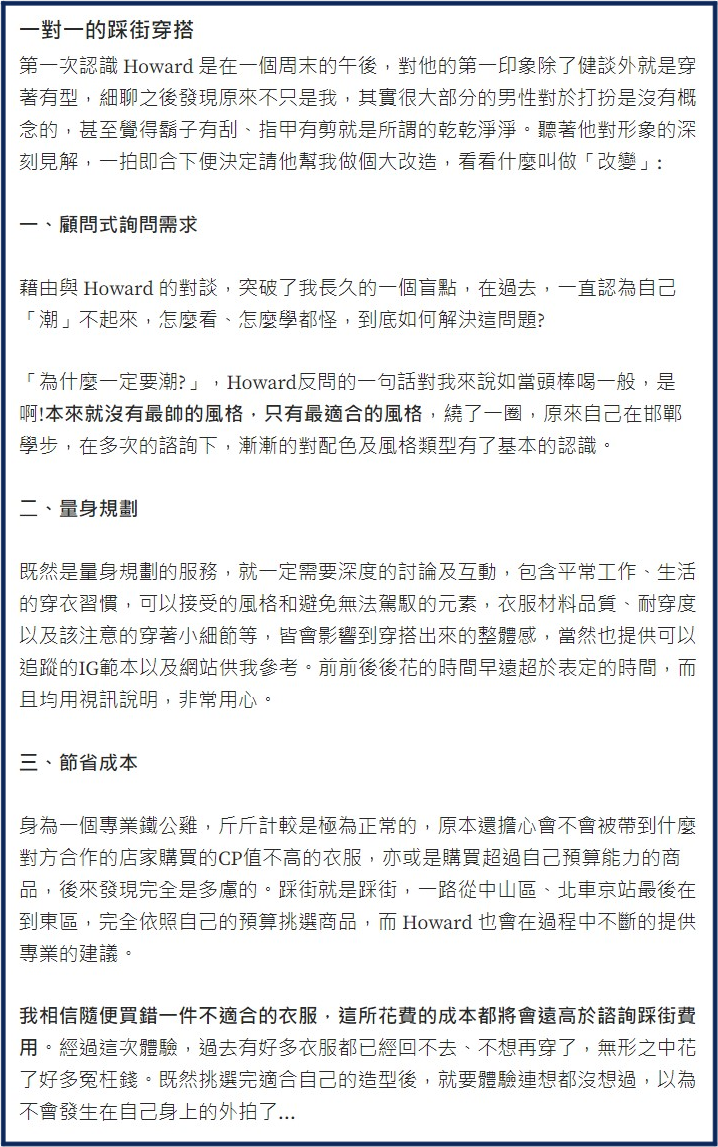 如果你和我之前一樣,想自己學習來摸索穿搭也是OK,不過我想好心提醒:要有會走過一段不短的過渡期的心理準備,這段時間你會需要不斷研讀大量穿搭文章或雜誌,加上要在逛街過程中不斷將學到的知識反覆驗證跟運用,那麼你不只需要花上至少1、2年的時間與數萬元以上的治裝費,還可能會跟我一樣最後丟掉一堆不適合自己的衣服,但現在你不必像我一樣走過這些冤枉路,只要投資6,600元,就可以參加「一對一穿搭型男服務」,讓你擁有一套適合自己的穿搭,又能帶走受用無窮的穿搭技巧,想想那些過往購買到的不適合衣物與總是得不到異性青睞的時刻吧,投資的時間精神與金錢早已遠遠超過這個數字了。