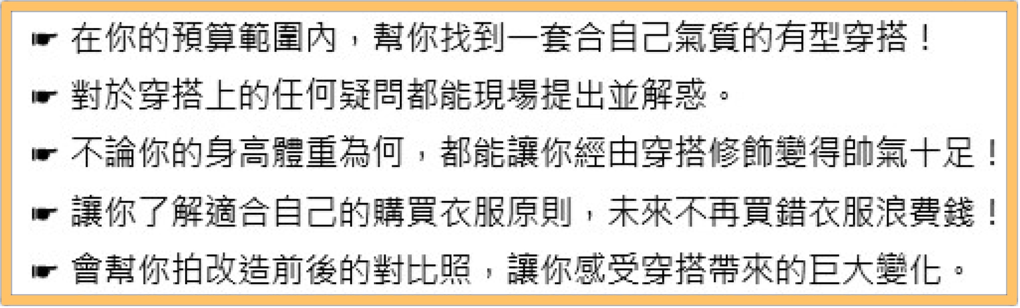 ☛ 想在穿著上看起來體面,有適合跟異性約會的服裝,但對什麼樣的衣服適合自己毫無頭緒。