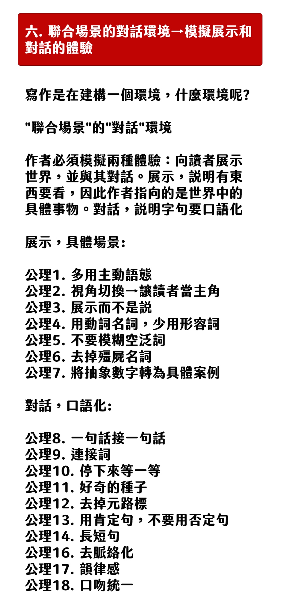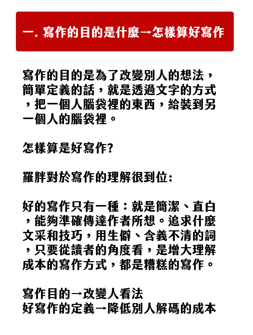 相反的,我教的是寫作「最底層的邏輯」,而這通常是其他寫作課上所不教,但卻是最基本,也是最接近能讓你真正學會寫作的觀念。