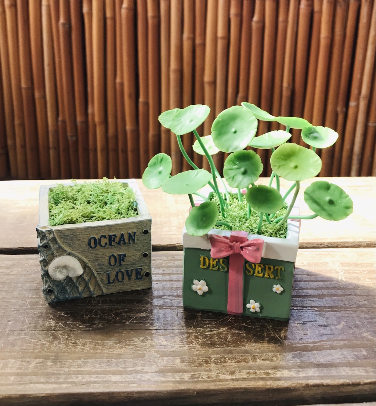 2、將做好的銅錢草組盆插在禮物盒或海洋風造型的花器裏。花器2擇一供選擇,尺寸6*6*5cm,完成作品尺寸: 6*6*10cm。