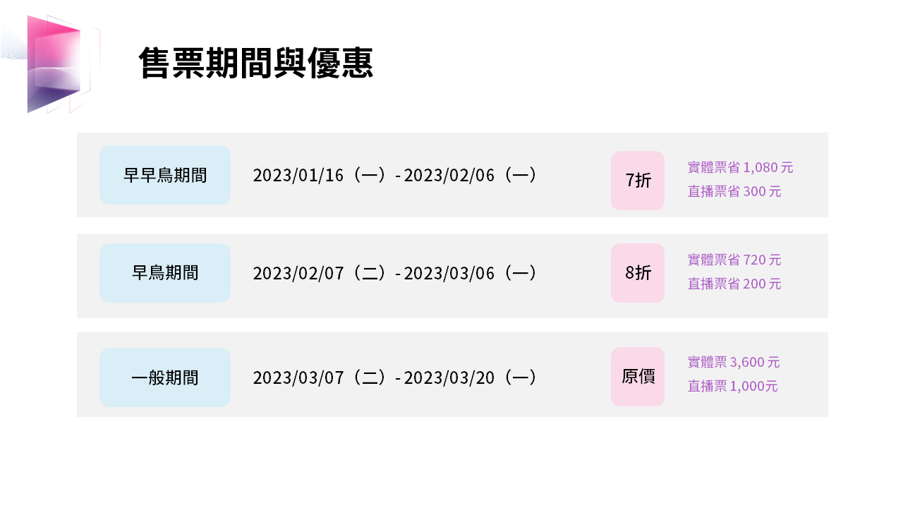 A:本屆發表會將於1/16(一)正式開放購票,完整議程資訊將於2月中旬對外公布