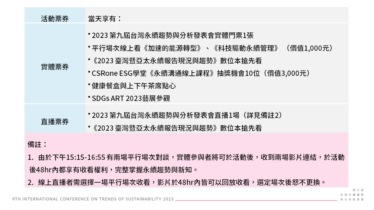5. 報名購票即贈《2022 臺灣暨亞太永續報告現況與趨勢》數位本搶先看1份,於現場報名入場時發放連結。