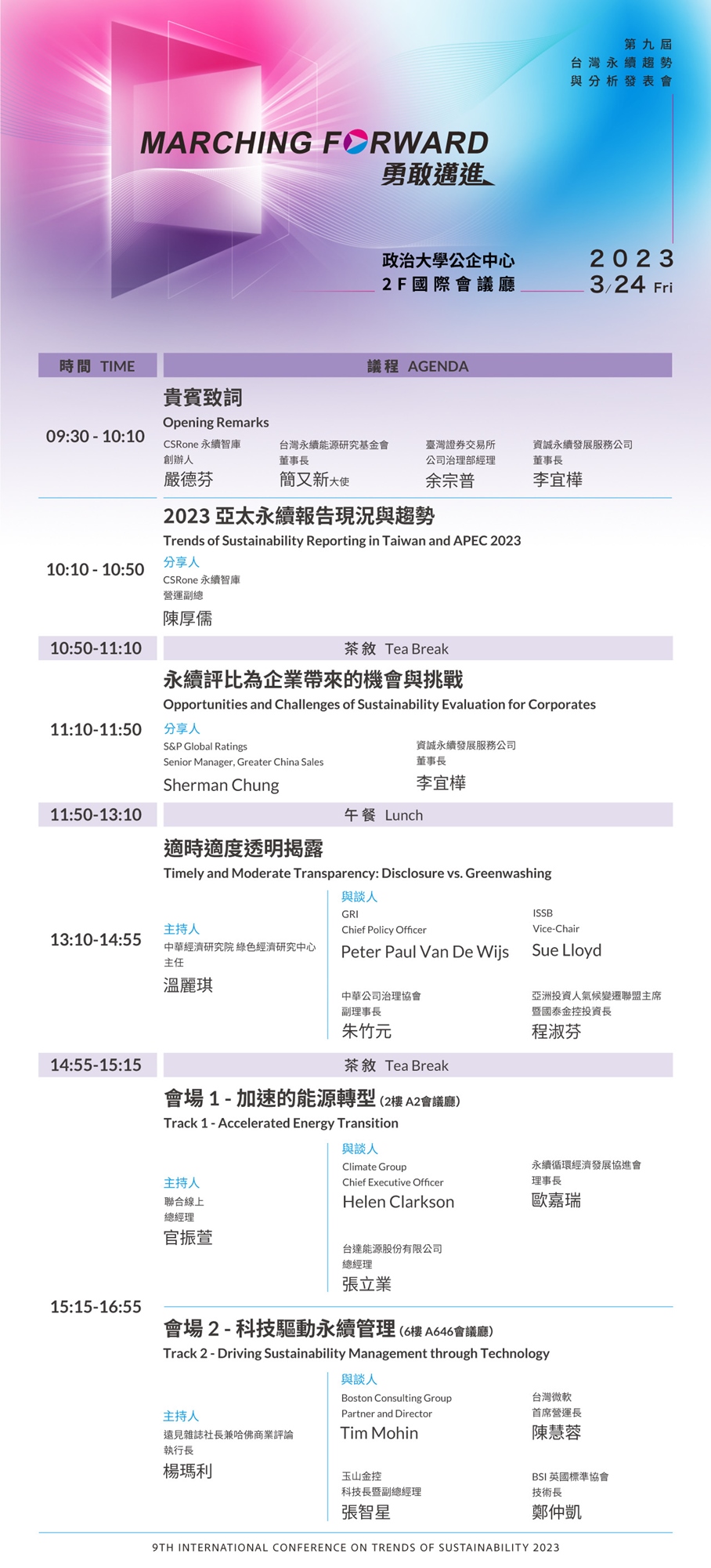 2023年第九屆台灣永續趨勢與分析發表會發表的分析內容,將加入淨零目標、生物多樣性、自然資本管理揭露等新指標,並公布全新 CSRone 永續評比系統;也邀請國內外重要標準制定單位、創新者以及標竿企業與會分享;透過四大議程,討論評比帶來的機會與挑戰、ESG 透明揭露與漂綠行動的分界,以及轉型議題重中之重:能源轉型與科技驅動永續管理,在快速變化與永續知識更迭中,汲取國際先行者觀點應用於在地市場,在永續轉型路上與夥伴一同擁抱改變,無懼前行。