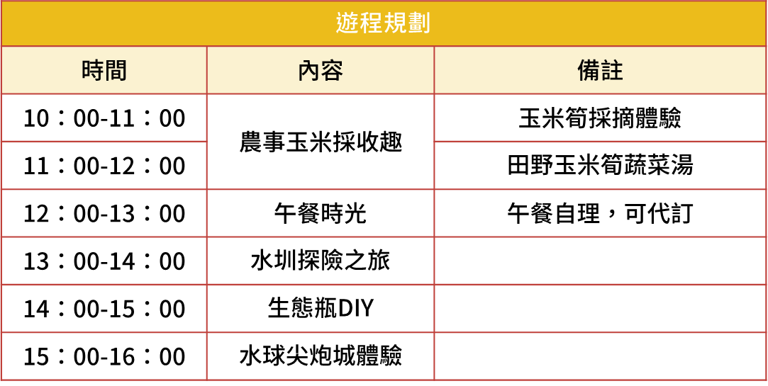 【遊程內容】 玉米採摘體驗、生態瓶DIY、水圳探險之旅、水球尖炮城體驗