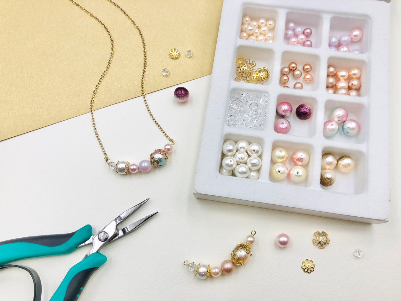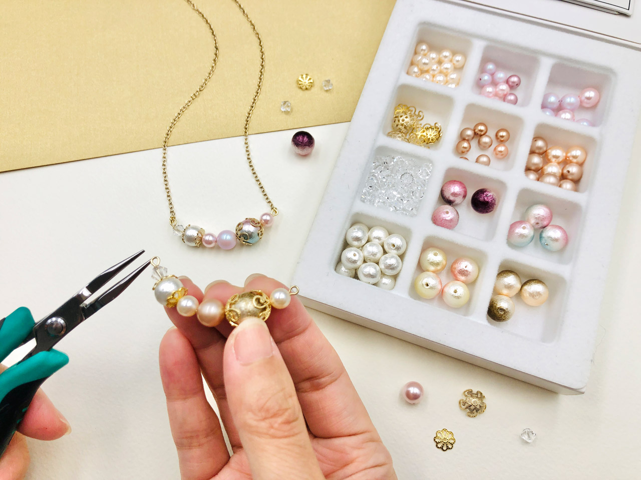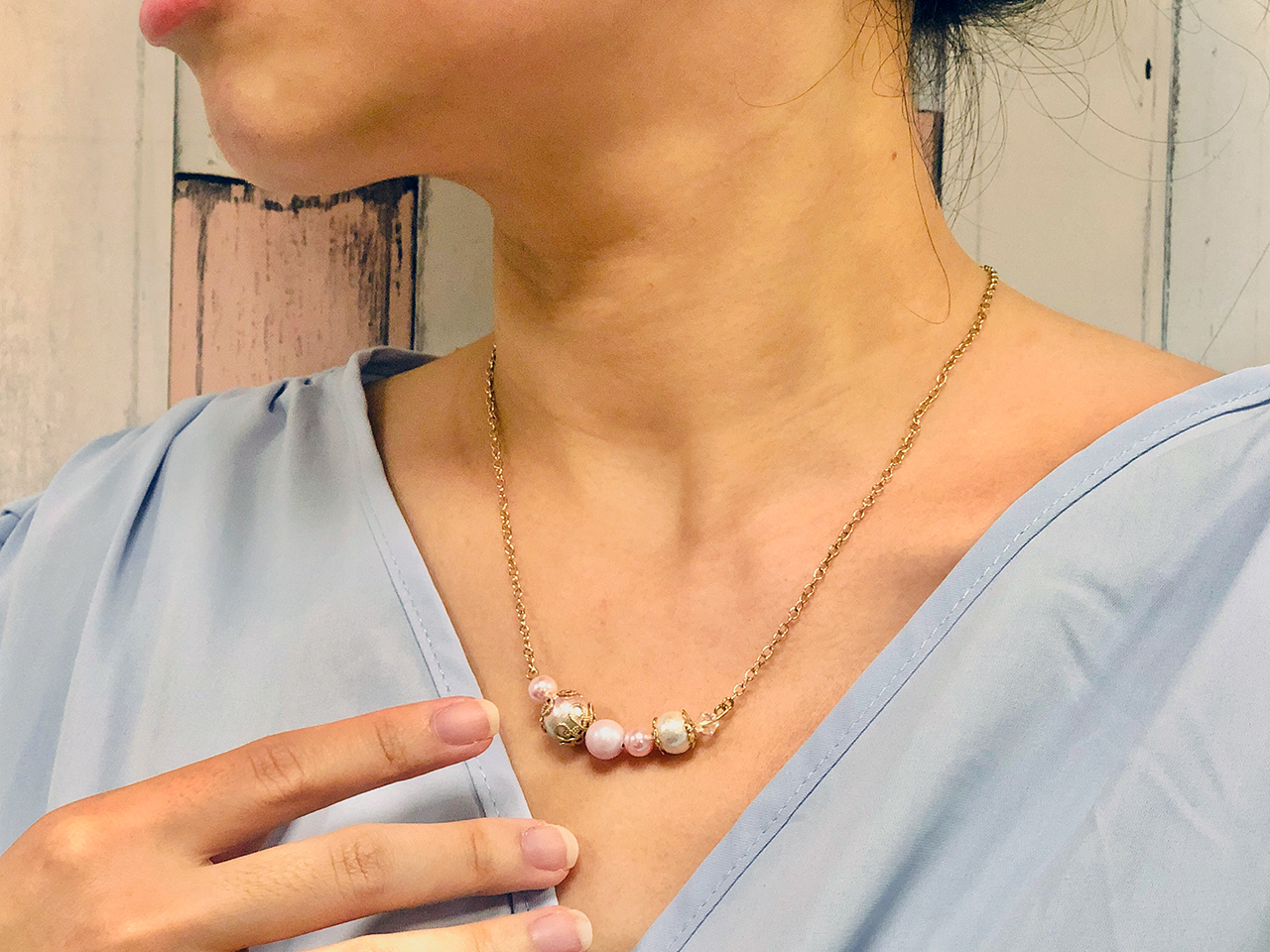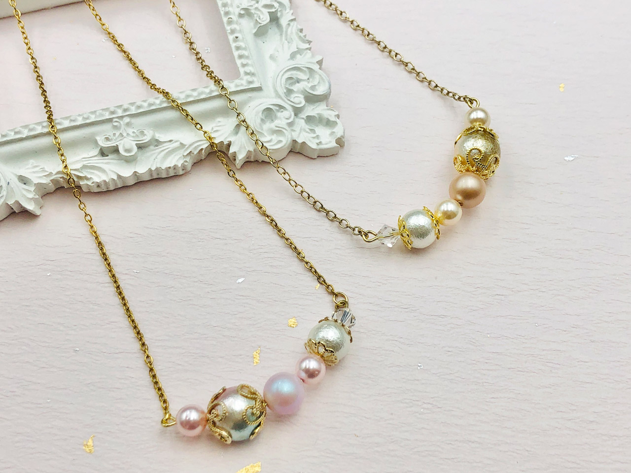 ●採用日本棉花珠,由棉花壓縮製成接近珍珠紋理的球珠。質地有如天然珍珠的優雅光澤。(粉色系/橘杏系兩色系可選)