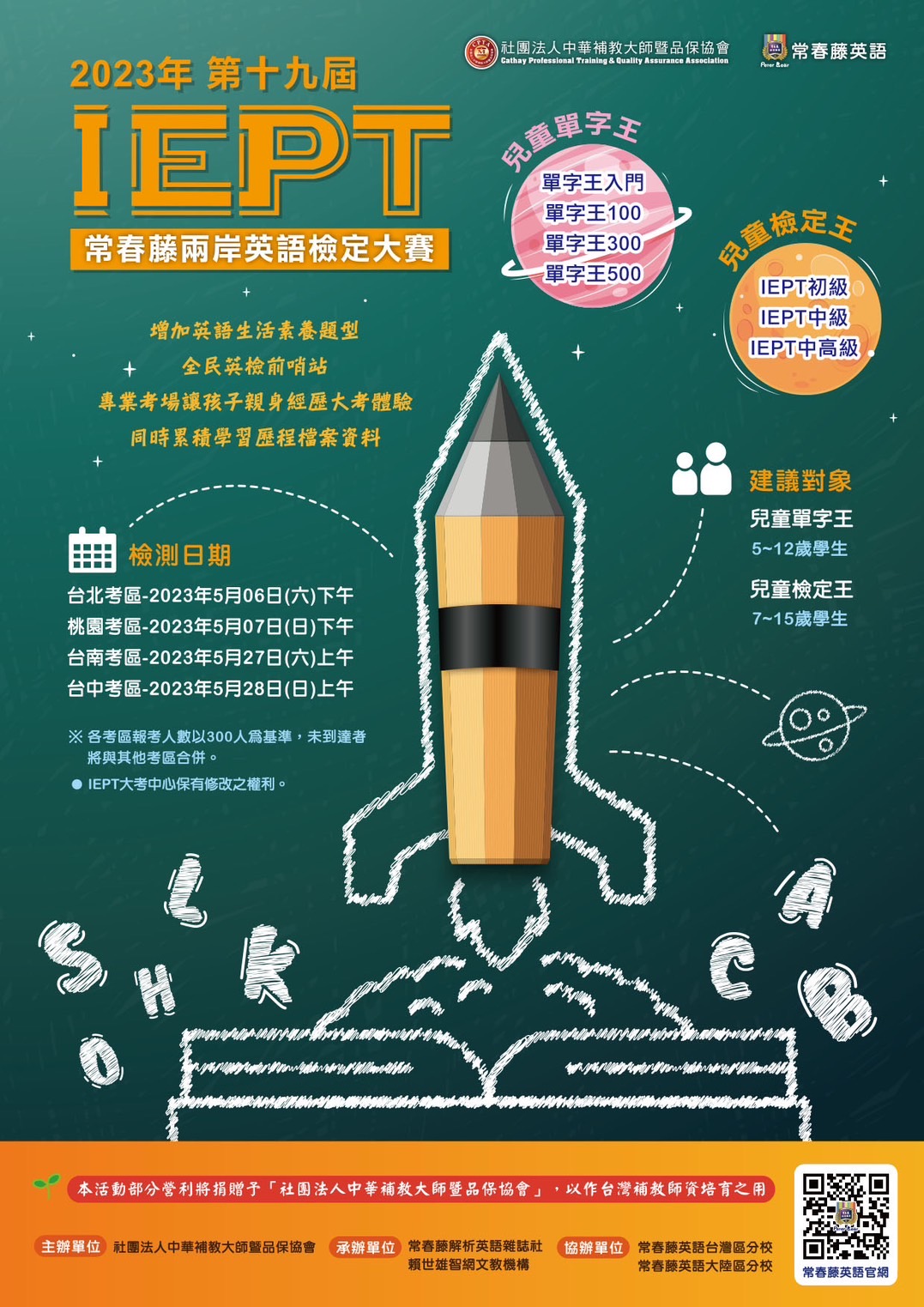 GEPT全民英檢是台灣英語能力評鑑指標,公務機關及大專院校不乏以通過全民英檢為必要條件。常春藤英語集團每年舉辦「IEPT常春藤兩岸英語檢定大賽」,將其定為全民英檢的前哨站,內容採生活應用及升學應考雙軸設計,以單字為根本,延伸至聽、讀、寫能力運用。檢測配套經專案設計,豐富應考樂趣,增加挑戰者的信心,激發英語學習動機,以利取得全民英檢認證。通過檢定測驗者除可獲得不同級數的證書(富收集樂趣),還可獲頒專屬獎盃!